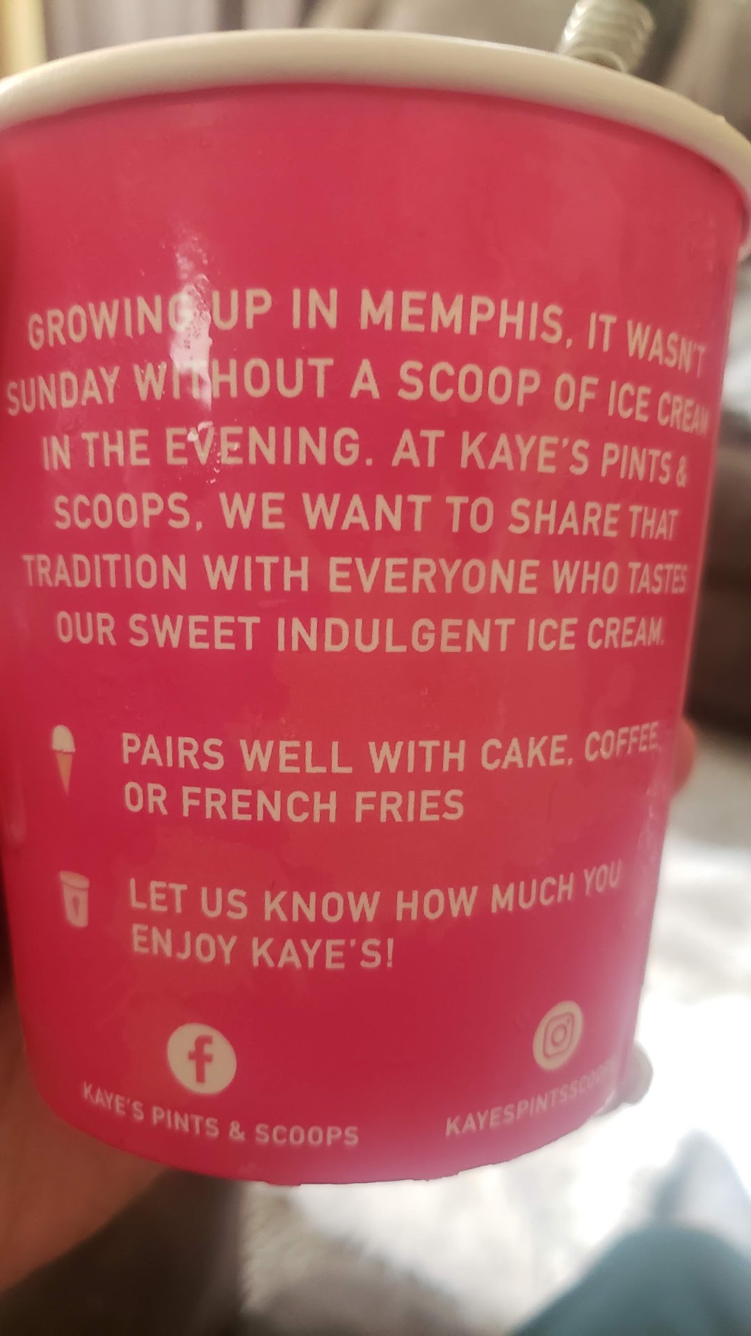 I'm an ice cream fanatic! I'm always searching for new brands and flavors. Kaye's Pints & Scoops did not disappoint! The owner greeted me with a smile and was pleasant. I purchased three pints of butter pecan, strawberry, and salted caramel. The butter pecan was rich, sweet, and creamy. I could taste the roasted pecans in each bite. The packaging is awesome too! A great addition to the Whitehaven area. I can't wait to try the...