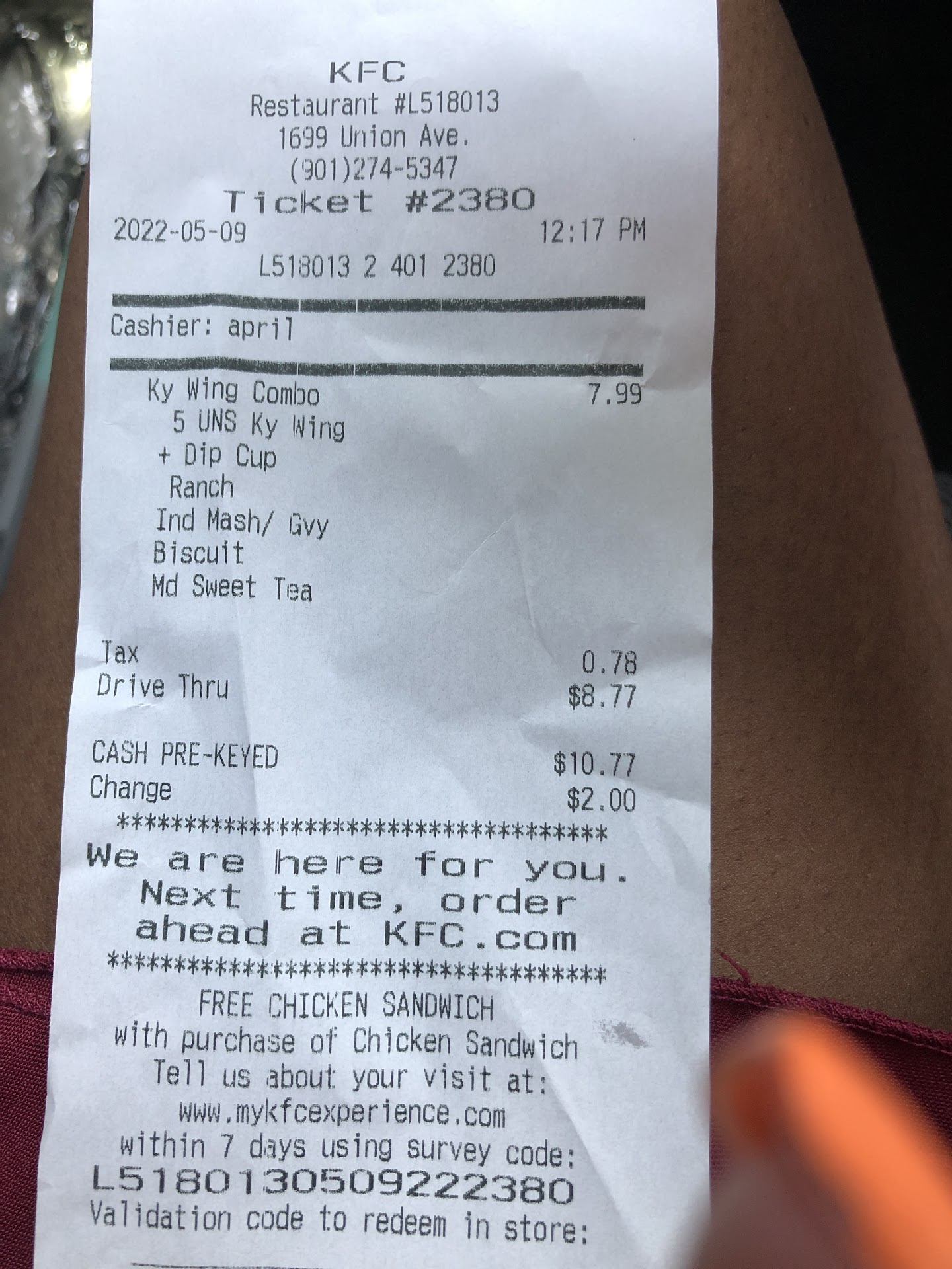Read moreWe pull up and waited for 5 minutes at the box before someone finally came on and the lady takes our order and then says sorry say you'll have to wait 10 minutes our machine is warming up. My husband said that's fine we can wait and processed with his order which involes mashpotatos she said we are out of mashpotatos for the bowl. So instead he orders something else with sweet tea . She said we are out of sweet tea. So he orders a different drink. She says with a lot of attitude pull up to the window. We pulled up to the window waited for 15 minuted before anyone even spoke to us a lady named Briana came to the window sounds like the same one who took our order and rolled her eyes and gave us our total we handed her our money and she gave us our change my husband said thank you and she gave him the ruddest look. We have been nothing but nice to her . About 5 minutes later we get out food we pull around check our food and notice a few items were missing so we pulled back around waited for at least 10 more minutes and then we told them we were missing some stuff and they asked up to pull up and she did give us our stuff and apologized for forgetting them and said they are hot out the oven. At least that wasn't as much as a hassle as we thought...