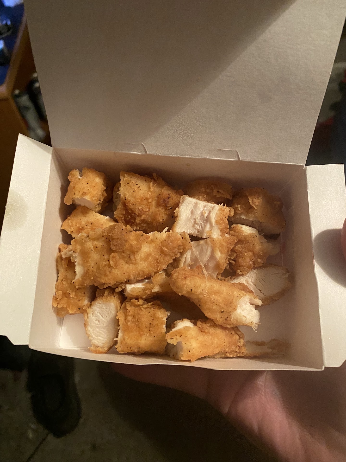You’re kidding me right? 12 Piece Chicken Nugget combo, 40 minutes before closing went through the drive through and the lady had to get us to repeat our order 5 times before she finally understood, no biggie, those headsets aren’t made the best. However, we pay for our meal and they tried to get us to pay for it twice. We paid once, got the receipt, waited. Got our drinks, and was asked to pay again. We told them we already paid, and they do not believe us. But, the lady gets snappy with us and just tells us to pull around to the front. Alright, maybe some misunderstanding, it’s Sunday night some snappiness happens. I was perfectly fine waiting another 15-20 minutes at the front and not being able to call them (considering the doors were locked and no one could get inside, and there were multiple people looking into the windows waiting too). But getting home to literally just cut in half chicken nuggets to get to the 12 pieces is plain disrespectful. No sauce either, just cut in half dry excuses of a 12 count. Felt like I was sharing with the class. I ain’t one to care all that much about miscounts or even a whole item missing. But really? Could’ve said you didn’t have enough for a 12 count and I would’ve just gotten a sandwich or just mac n cheese...