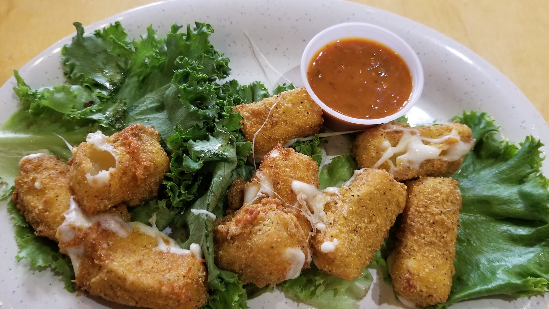 Pathetic. I'll have to update my review. This place is slowly going to hell in a handbasket. Indifferent staff and poor kitchen quality. I'm not sure when or how or why, but the portions are dying, and the quality is worse. I've been in food service for over a decade, and rarely have I seen such indifference to customer care and presentation. When I worked here years ago back when it was Bigfoot Lodge, everything was top notch and deserving of its accolades. Now it's a joke. It took 10 minutes just to get a mixed drink on a dead Sunday, and the picture is what I got of the now pathetic and mangled cheese bites. This isn't an isolated incident. The time before I came to this location was just as bad. Go to the Cordova location if you want a true Kooky Canuck experience, because this place has died.