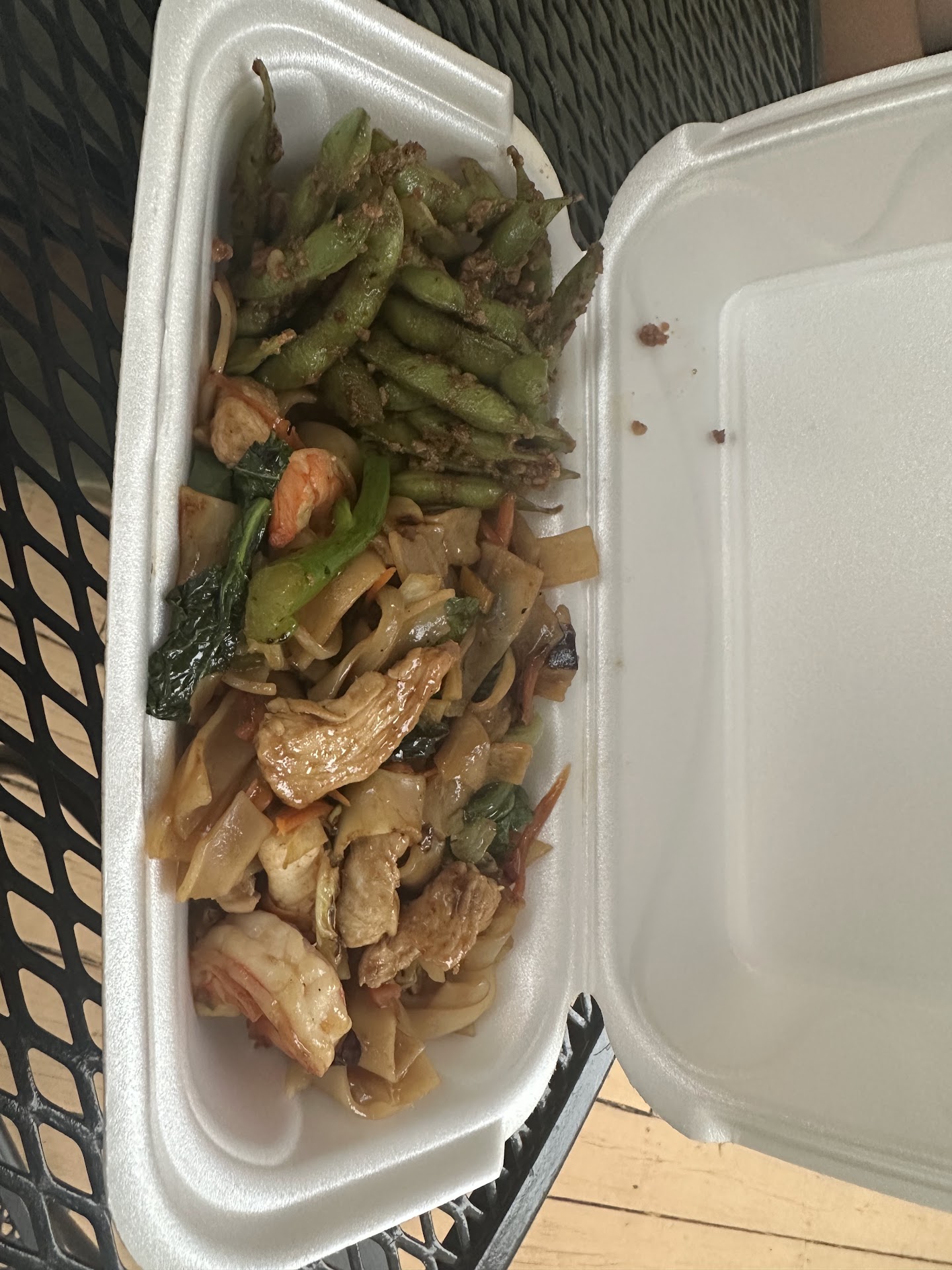 • Massaman curry Jasmine Rice: A classic done right. The curry was rich but it could be richer and creamier with the perfect blend of spice and coconut, generously loaded with tofu. The jasmine rice was soft, fragrant. Might be slightly over cooked for my preference. • Pad Kee Mao (Drunken Noodles) with Edamame: The noodles were stir-fried to perfection—chewy, savory, and packed with chicken, shrimp, and crisp veggies. The edamame on the side was a pleasant surprise, sautéed with spices that added a bold, addictive crunch. The best drunken noodles I ever had. • Hamachi Kamayaki: A hidden gem! Crisped skin, juicy interior, and a smoky char that paired perfectly with the soy-based dipping sauce and fresh lettuce.