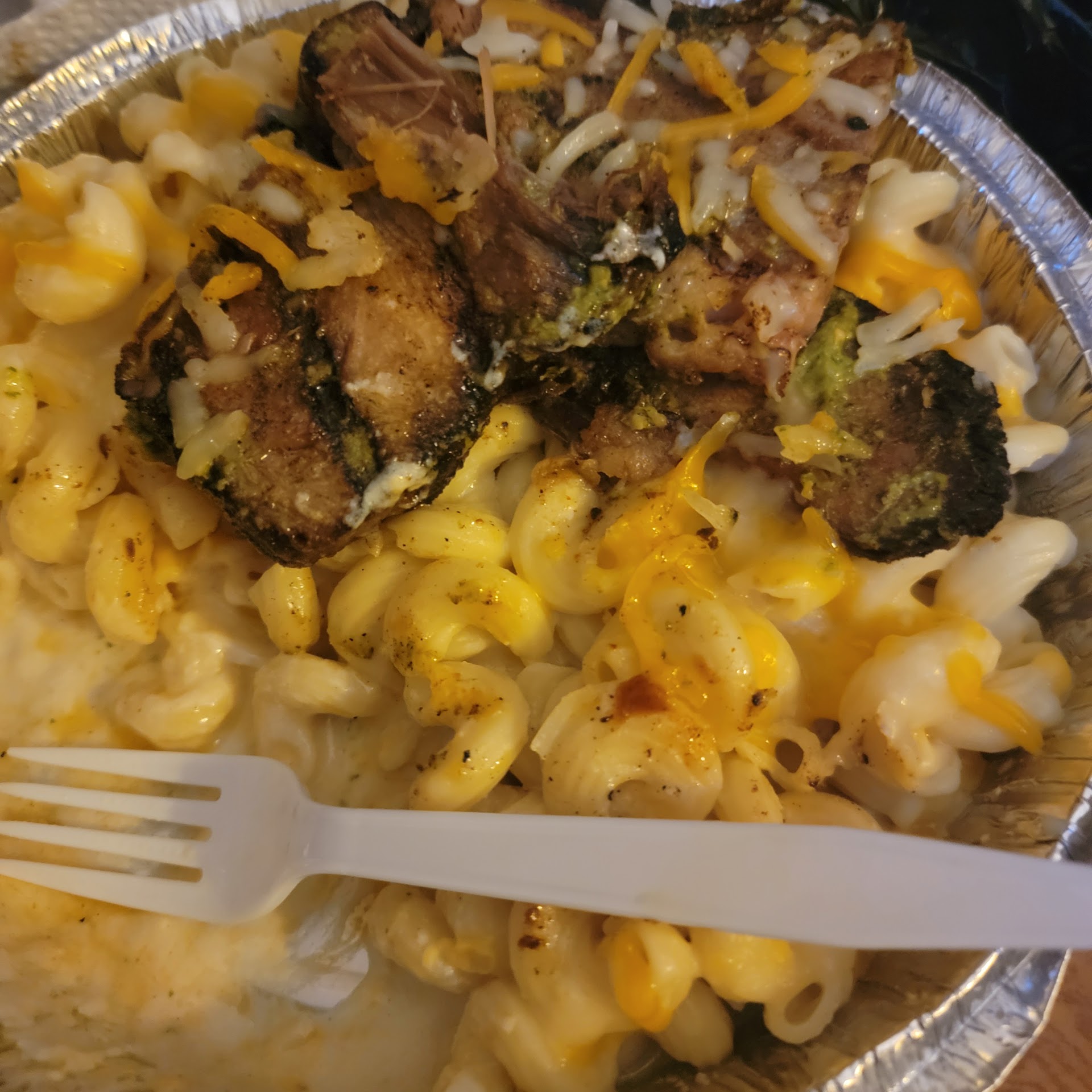 Now this brisket with cheesy pasta. The bricket is heavenly. Oh, I failed to mention that I ordered to go each time. So the spicy sauce, green mande sauce, and barbeque sauce served this dish. The barbeque sauce brought this well seasoned meat to life. Well, the restaurant is supposed to be a spin on West African barbeque.