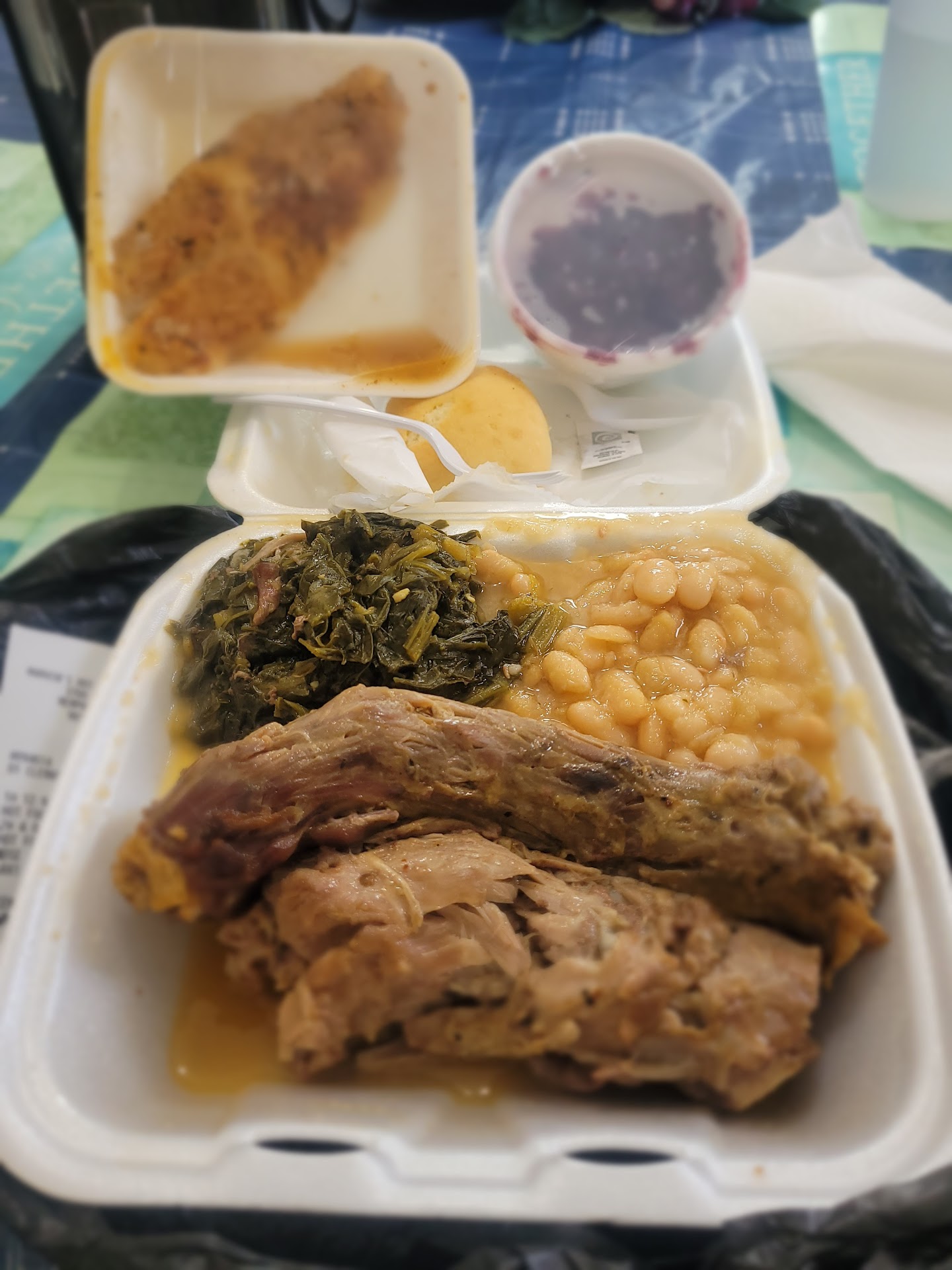 You pick one meat (there was baked chicken & everything else was fish or pork) and two sides. There were lots of options—mashed potatoes, corn, broccoli, spaghetti, a cobbler dessert (which I think adds on a dollar), etc. You also get to choose between a roll or cornbread. They wrap the styrofoam plate in plastic wrap (which is nice for transport), write the price on top (~$9-10/plate without extras), and you take it with you to the front counter.