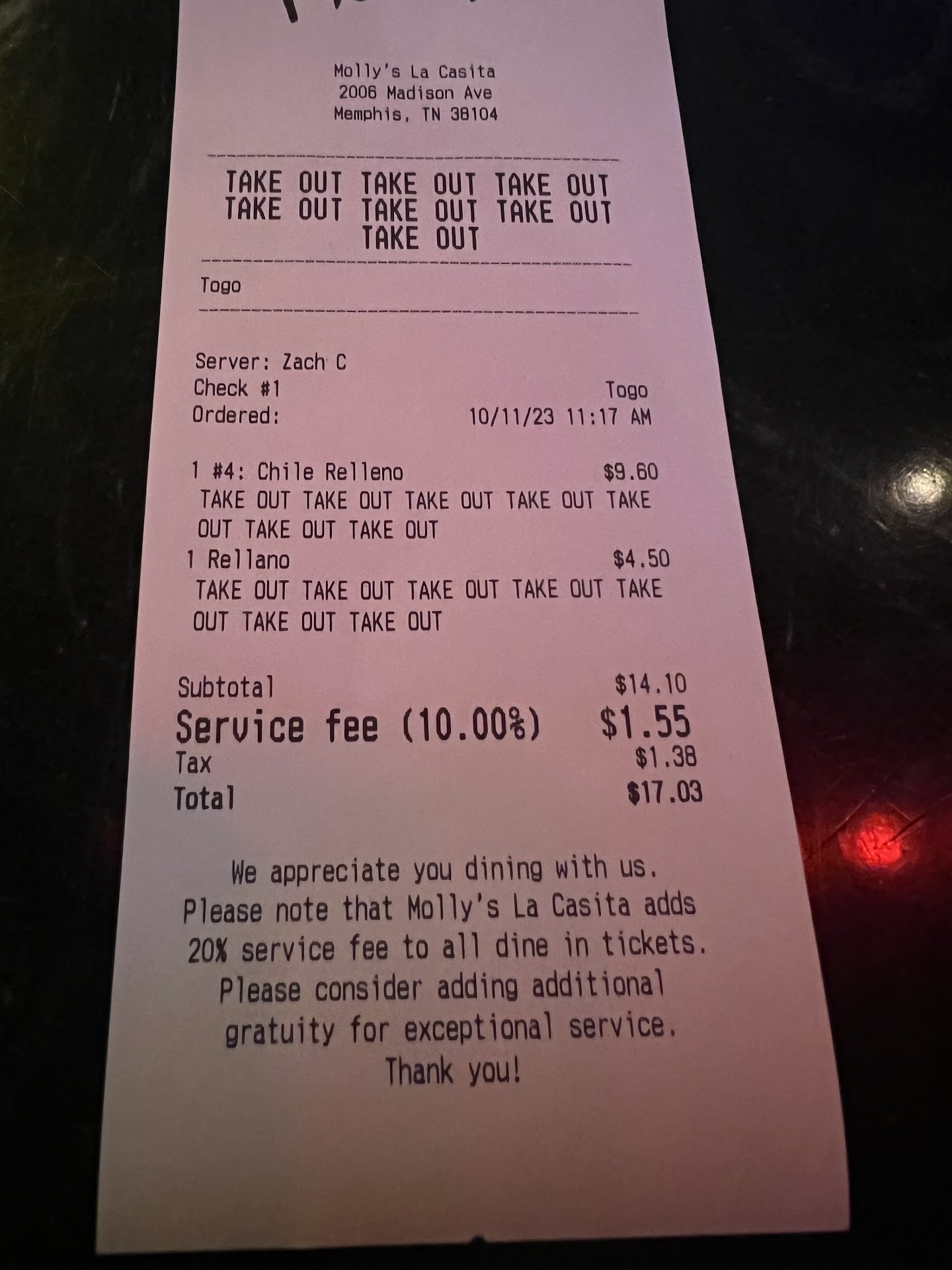 Now since I ordered takeout i got my ticket before the food of course. I noticed a 10% service fee. At first I thought maybe its to cover the togo box snd plastic ware. Then wondered why call it a service fee? Total was 17.03 which I originally planned just leaving a 20. I looked at google reviews and noticed that they charge a 10% and a 20% service fee for takeout and dine in. Takeout technically shouldnât have a tip cost but I typically do if Iâm treated well. Dine in should be totally up to the customer. If the server just did their job and nothing more 10%, if they did theyâre job well 15%, if they do theyâre job and are personable interact well with customers 18-20%. It id a service oriented job and is paid based off the service you receive. No different than getting a raise at a hourly job for doing well. Do a good job and the majority of customers will tip well. Giving an automatic 20% tip which is high industry standard gives no incentive to give great service. I could honestly see a 10% service fee, then we the customers could decide to tip more or not. This is not a good practice in my opinion.