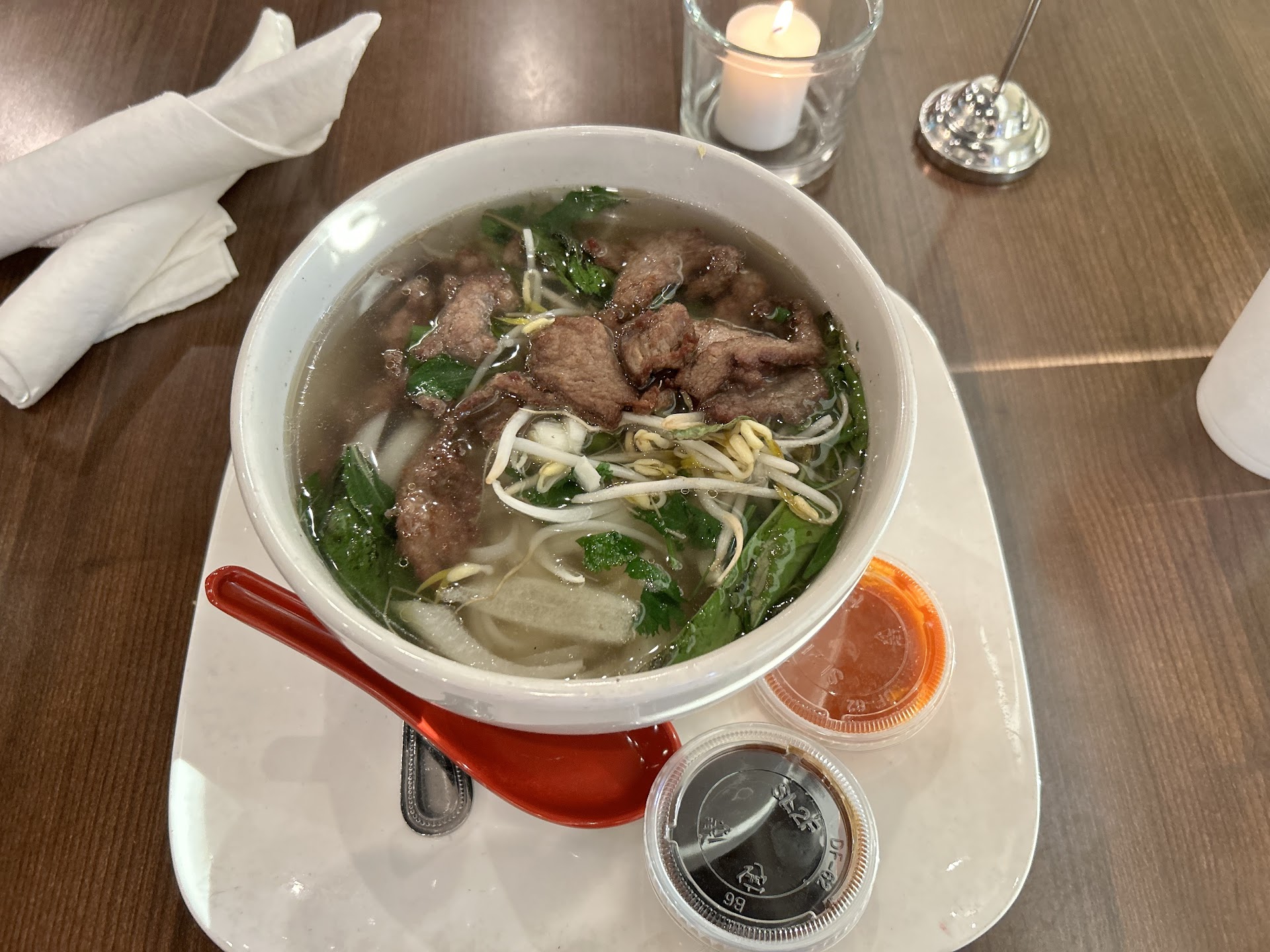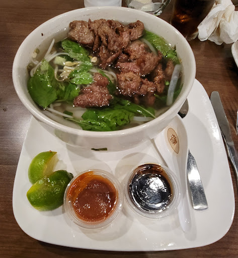 So the first odd thing to me was that I was asked if I wanted rice or flour noodles. Flour noodles are not an option in any Vietnamese themed restaurant I've ever seen. When my bowl arrived I noticed right away that the broth is the wrong color. It looked like chicken pho, rather than beef, and it tasted similarly mildly. The bean sprouts, Thai basil and cilantro are already included in the dish, instead of coming on the side for you to curate to taste. Condiments on my plate were a sambal-derived hot sauce (like a less smoky sriracha), a milder than usual oyster sauce (maybe it was oyster mixed with hoisin), and a bit of lime.