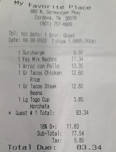 Ā Ā Ā Read moreThe food was very good and the prices were very good too. It was a huge portion... so not only did I have lunch, but I have dinner too. The menu has a lot of options, and based on my experience today, I'll be going back to try some more of their dishes. Today was my first visit, but My Favorite Place, is now my favorite place for Mexican dining. I believe they have live music on Fridays, so I think the next time I go, it will be Friday evening.