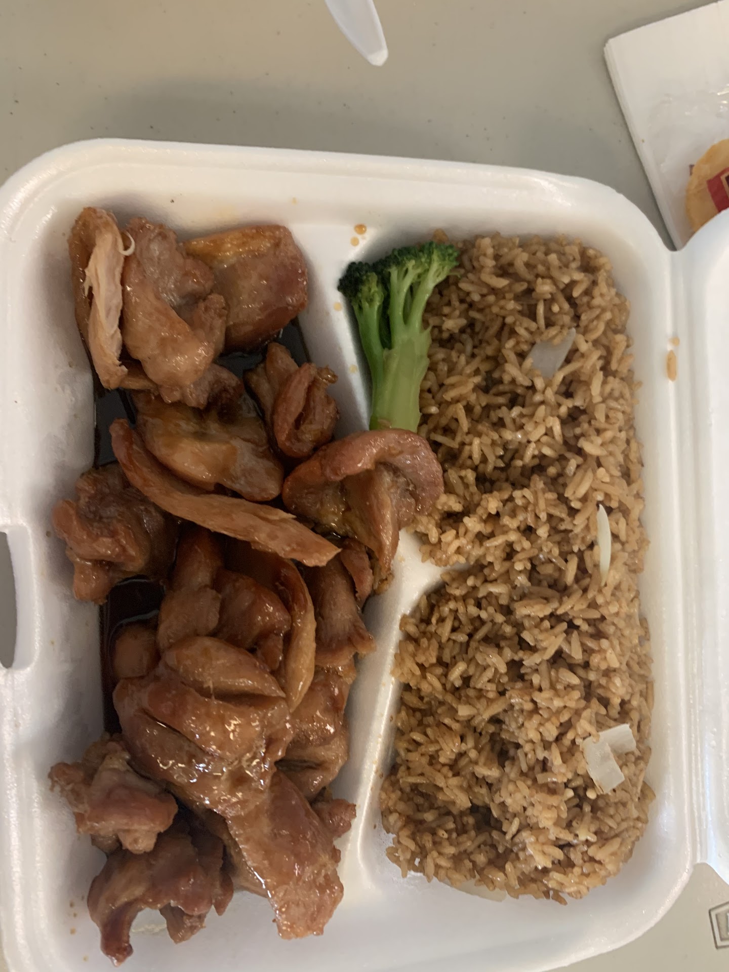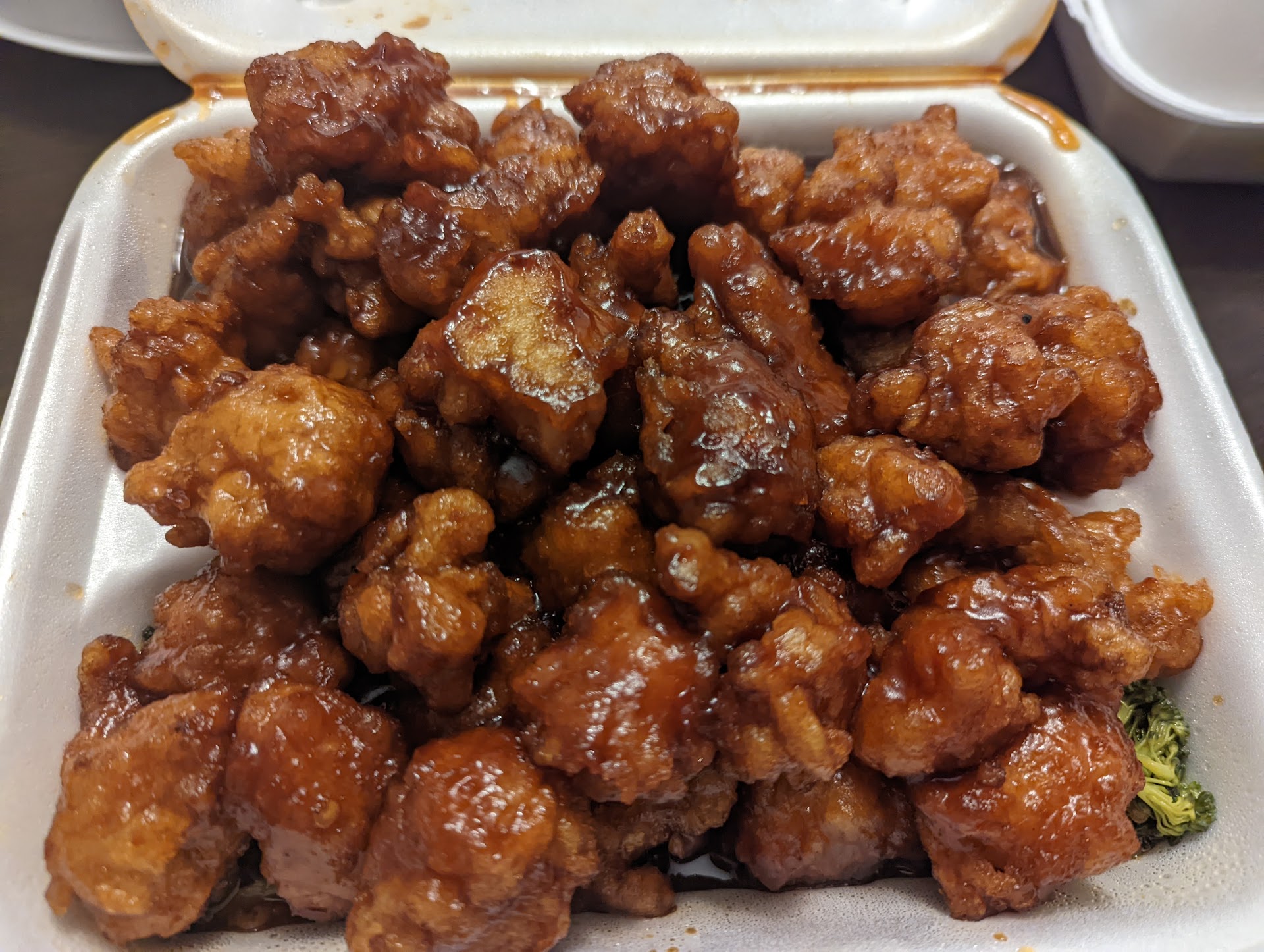 The General Tso's chicken was okay. Large chunks of chicken, but the breading and chicken itself was dry and bland. The fried rice that came with the combo was bland. The General Tso sauce was tasty and not too gelatinous.