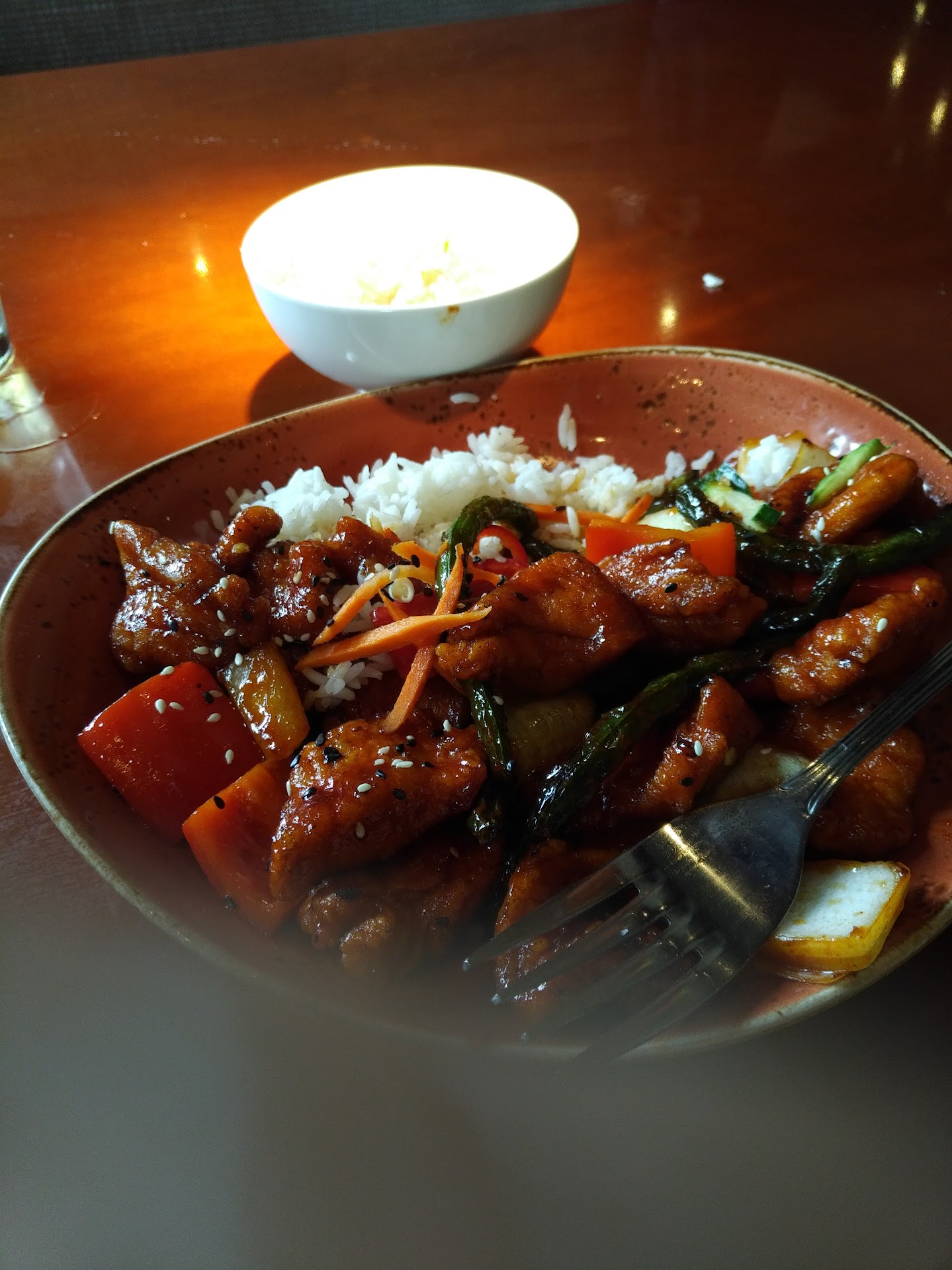 They give you the option for white and brown rice for every Antree and I ofc ate mine w my pepper steak and my MF ate hers w the chicken normal white rice nothing special but that fried rice stole the show overall I spent 80$ before tip q little on the pricey side which was expected but I'd give this place a nice 7/10 have to try more of the menu for sure atmosphere was nice need more waiters only 2...
