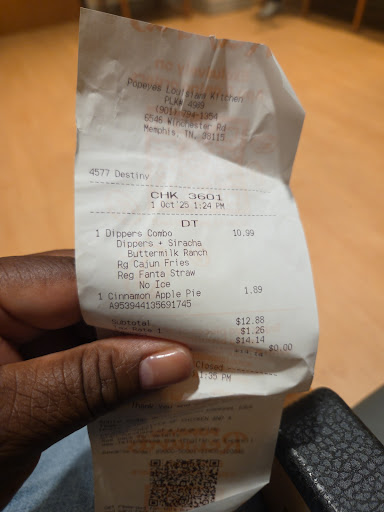 Read moreThis was the absolute worst experience ever at a Popeye's restaurant. We waited in the parking lot for almost a half hour. I went inside actually to request a refund. I stood there and watched three persons pick up to go orders of the same items I was waiting on. When the manager noticed I was in line and likely had observed what was going on I heard her ask staff where was the order ("Spicey tenders")? A staffer quickly but my order in a bag and was headed out the door. I stopped her and told her I was the driver of the auto she was instructed to bring the order to. My wife and I sat down for dinner having purchased your product to add to the rest of our meal. We expected to save time. Poor service dashed that desire but the coup demands grace was our utter disgust in receiving the most tasteless chicken imaginable. Actually I not certain if I am more disgusted with the waste of my time, my money or surprisingly disappointing food I received. Not only was it not spicey; it failed miserably in relation to your other products. I think the only thing that could have made my experience there yesterday afternoon would be if the place was robbed I got shot. I have no future plan to spend another penny at that location or any other Popeye's restaurant in the foreseeable future. I am done. P. S. You should provide an option to reflect total dissatisfaction. The one star...