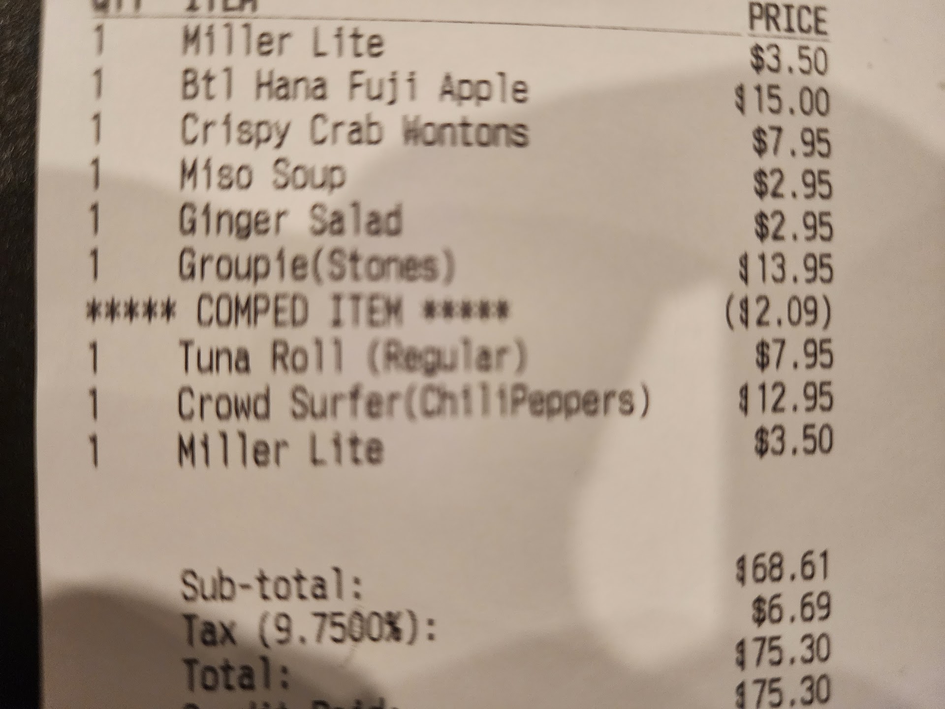 We were seated at least 10 minutes before we were acknowledged and asked for drink order. It took a very long time to get one bottled beer. We ordered an appetizer sampler and one sushi roll. Those came fast and were really good. They claimed to be “out of” silverware (though I could see all the silverware on a cart next to the bar) and gave us to go plastic ware.