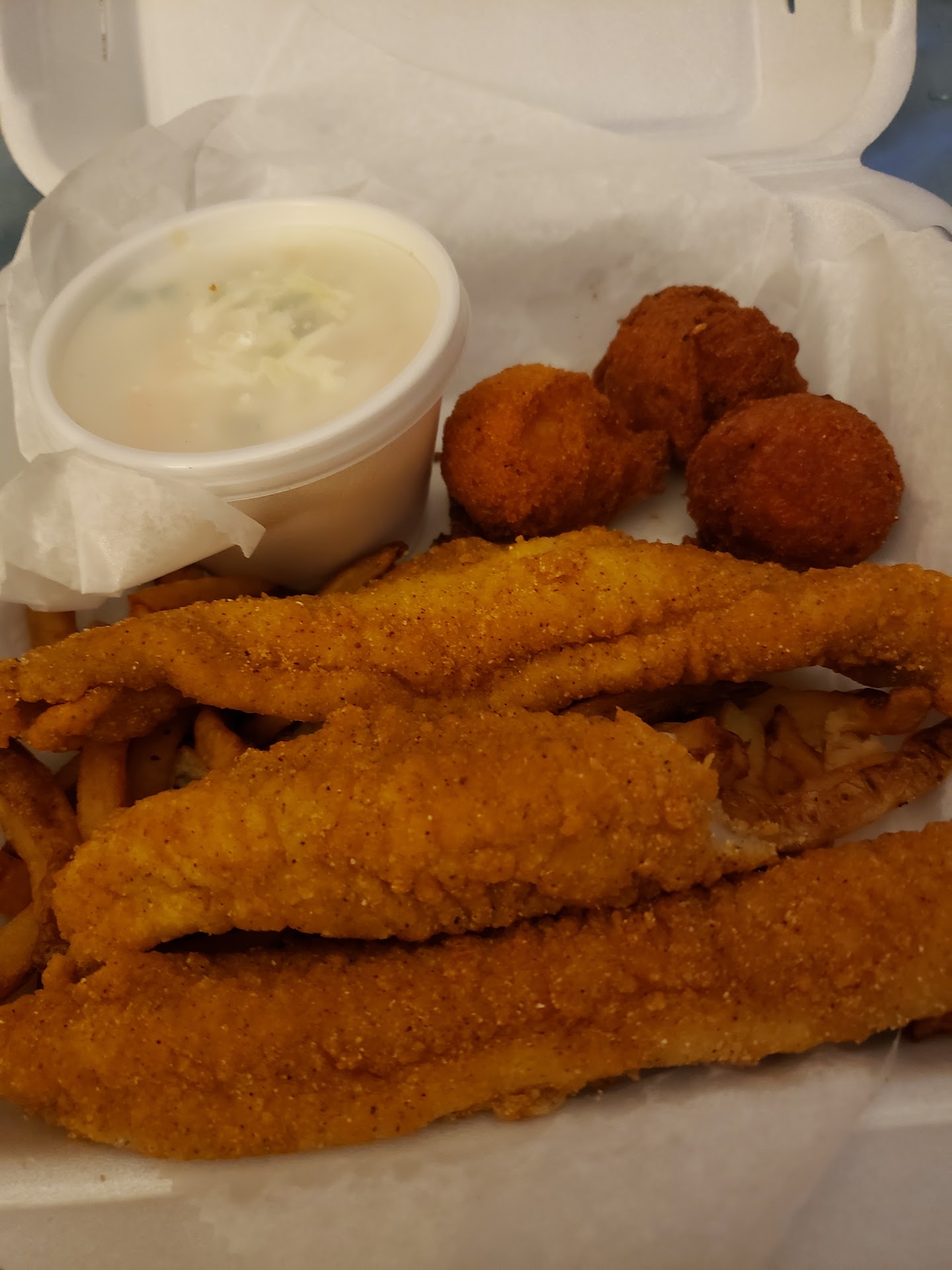 3 of us ordered the fried catfish platter + 2 sides from their menu. The fried catfish was fried to perfection, was perfectly seasoned and was not greasy at all.