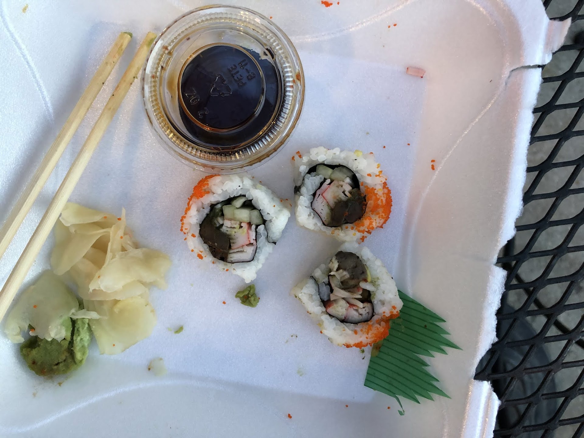 The sushi was amazing! The quality was fresh and the presentation of it all was excellent. They gave me the perfect amount of wasabi, soy sauce, and ginger as well. Most restaurants skimp you out of those things but I was given more than enough! Chopsticks were also in the bag which is a plus because some places forget these little important items.