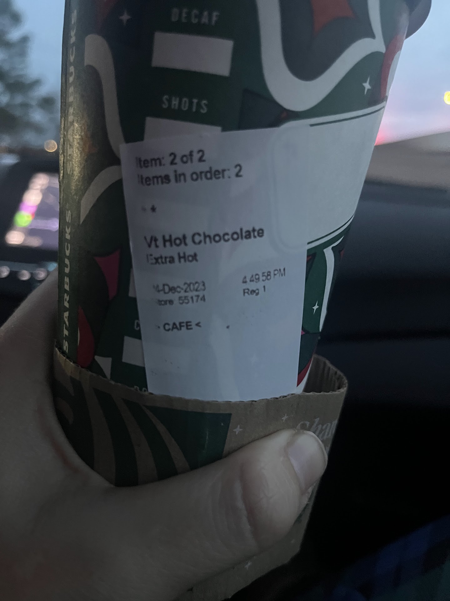 Read moreThe coffee was heavy on the syrup. As a pick-up order, it was on time but not complete as I had to go back to receive what I had already paid for. When I went back, I was met with friction even when I showed proof on my receipt. It's a shame that Starbucks customer service is now trying to make a customer feel bad for asking what I had already paid for. I was afraid to even ask for them to remake my coffee. So, I just threw it away in the trash can on my way out. It was a $12 waste of money and I would not recommend this Starbucks...