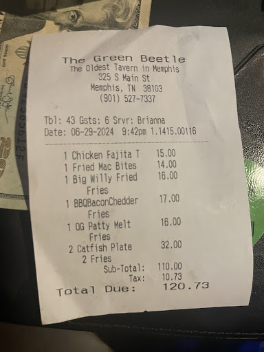 Read moreThis is normally the 1st place we go to when we get to Memphis, but I will be rethinking that after our visit on Saturday. The waitress was very rude and refused to serve me alcohol. My fault, because I forgot my ID, but I am 58 years old and was not asked for ID when we were there Friday night. If you are going to require ID, it should be from everyone, not just when your waitress decides to be rude. 2 tables were seated after us. The 2nd couple that was seated after us received their food first? The 1st couple that was seated after us got their food next? The waitress originally told us that the kitchen was backed up. After the 2nd table got their food and we were still waiting, she gave us a pretty poor story. She told us that there was a shift change and the new cook grabbed the wrong orders... I call BS to this one. So he grabbed the 2 orders that were put in after ours, but somehow missed only ours??? I ordered a Buffalo chicken salad that was supposed to have tomatoes, onions, cheddar cheese, and pickles on it. I was lucky that it even had chicken. The person with me ordered Philly fries and didn't get them because she put his order in for just fries, said she didn't hear him. It's a shame that we may not go there again because it WAS one of...
