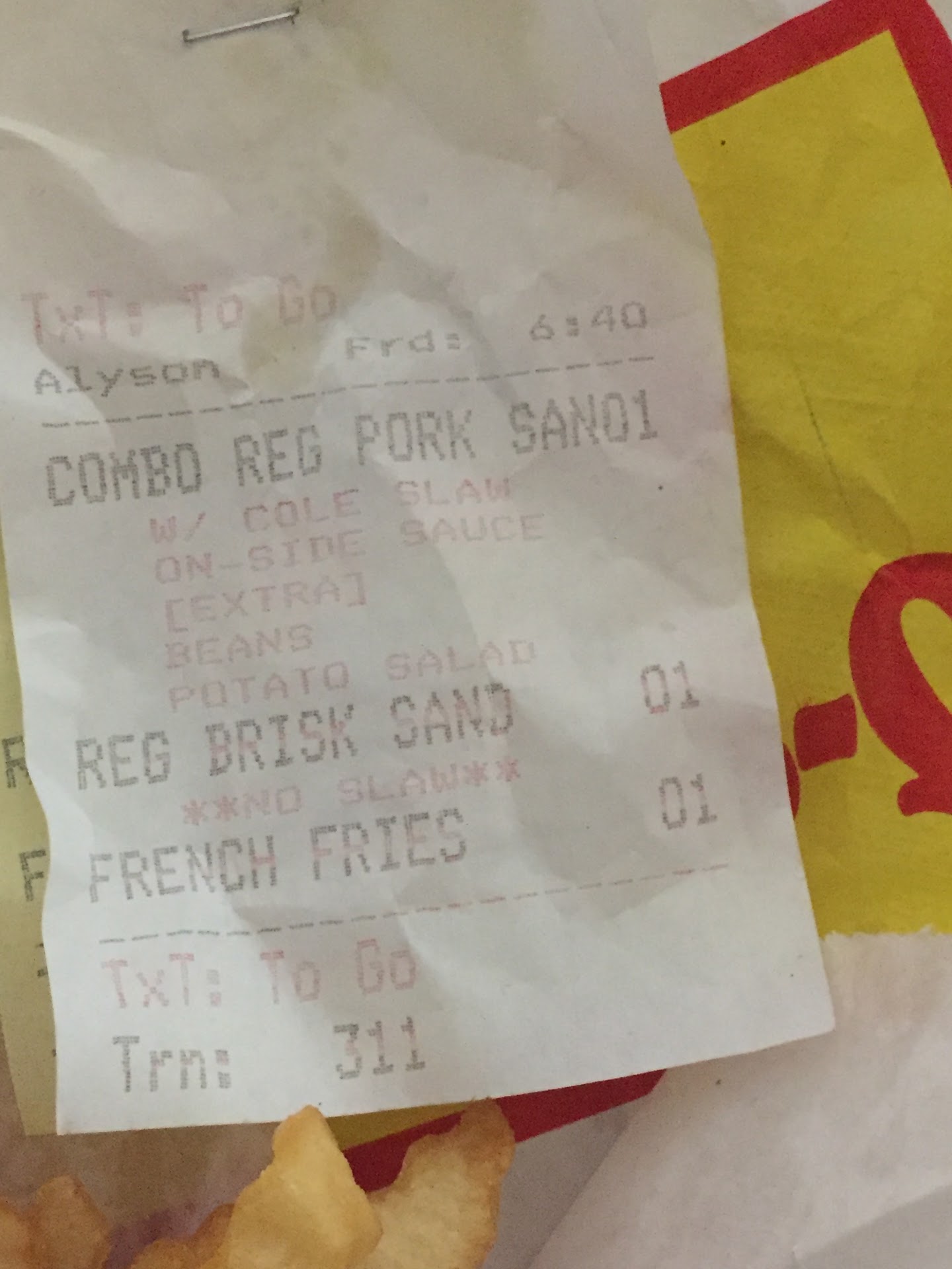 We love getting Tops BBQ and it's our favorite place to get take out for dinner because it's always going to be awesome because it's Top's and this is the one and only place that we've never even thought about our order getting messed up or wrong because they got absolutely everyone and they got your order and dont be surprised because its probably already in the bag and ready for you right after you pay for it and they got this down and they most definitely work together and they are always happy and very friendly and the fact that you've got Great People that are serving you Great food and we always get the Jumbo pork BBQ and it's stuffed with BBQ and slaw and there is no such thing as a skinny BBQ at Tops its exactly the way it should be its fat and filled with BBQ and slaw you get some in your mouth and you get some in your plate and thats the way its supposed to be and we get the beans and frys and Sweet Tea and nobody has Sweet Tea like they do its the best Sweet Tea and its so awesome that I'll be back for Sweet Tea before I make it anymore just not the same and if you haven't tried the Cheese Fries oh my goodness those are the best Cheese Fries and if you haven't had them I'm telling you that they are truly Awesome and sorry I forgot to say anything when I made the review and the fact that everybody loves Tops BBQ and you guys are definitely got your Q going on here in Memphis and you have a lot of customers that are thankful grateful and blessed to have Tops BBQ with the finest people and everyone's favorite Tops Bar-B-Q Berclair and Thanks to all of you and God bless you and know that you are loved and appreciated and that's straight from the heart and Yall are doing a Great Job and I hope its all good I checked it twice lol just saying!! Have a Blessed Day and God bless everyone at Tops! Sending Blessings...