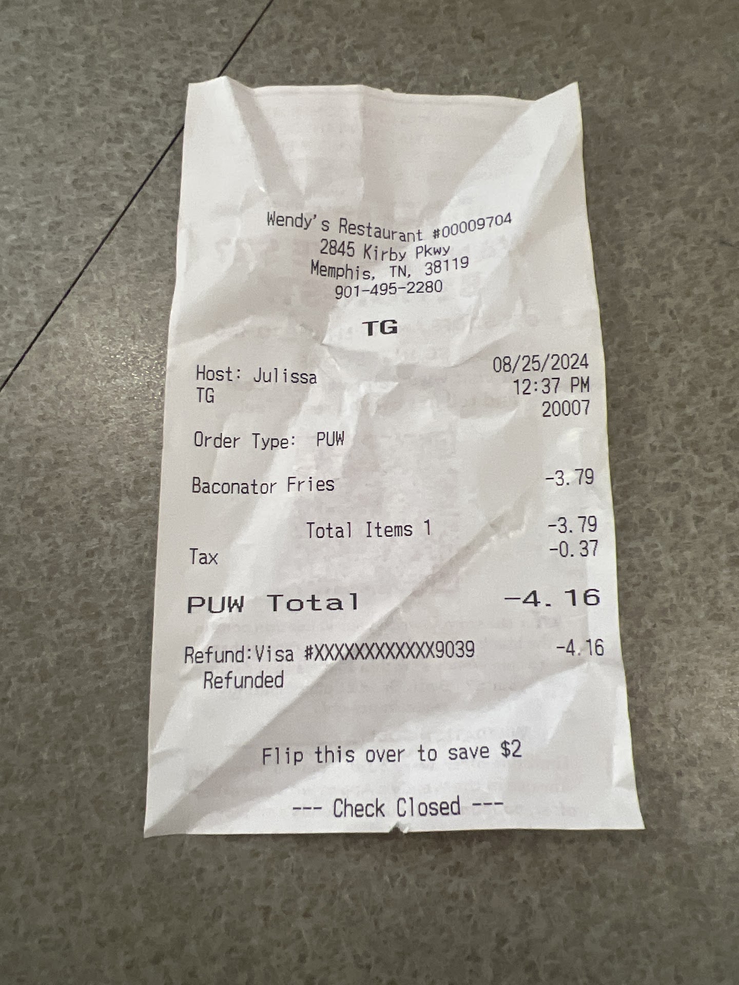 Read moreDon't come here after 11:40pm. It looks open. They won't take your order. You will just sit at the drive through until 5 minutes till, then they'll say they are closed. Or if you go to the window, they won't acknowledge you are sitting there. My vote for the worst Wendy's in Memphis. UPDATE FROM A YEAR AGO: WELL SPEED HAS IMPROVED HOWEVER... THE EMPLOYEE AT THE DRIVE THRU WROTE DOWN MY DEBIT CARD INFORMATION AND DECIDED TO FEED ALL HER FRIENDS ON MY CARD! I FILED A FRAUD ALERT AND CANCELED MY CARD. I GOT MY MONEY BACK FROM THE BANK. I NEVER GOT AN APOLOGY OR EVEN A KISS MY BUTT FROM WENDYS. DONT USE YOUR DEBIT CARD HERE FOLKS! Slow.slow.slow Must be something about my looks. Took 10 minutes to take my order, but the guy behind me was waited on as soon as he walked in. I'll go there one more time. We'll see. This is the one more time, I cant believe its still slow. The food has gotten worse too. I mean really old burgers. The condition of the condiment area was gross, and get this ..the drink machine tasted moldy. I think this store has it the absolute rock bottom. Slow service, poor quality, and dirty as a prison bathroom. Im outa here. Gotta go get something to eat somewhere else. I won't be back until I see a sign that says revamped Under New Management. Look at all the bad reviews, I don't know how this place is even open. Dave would roll over...