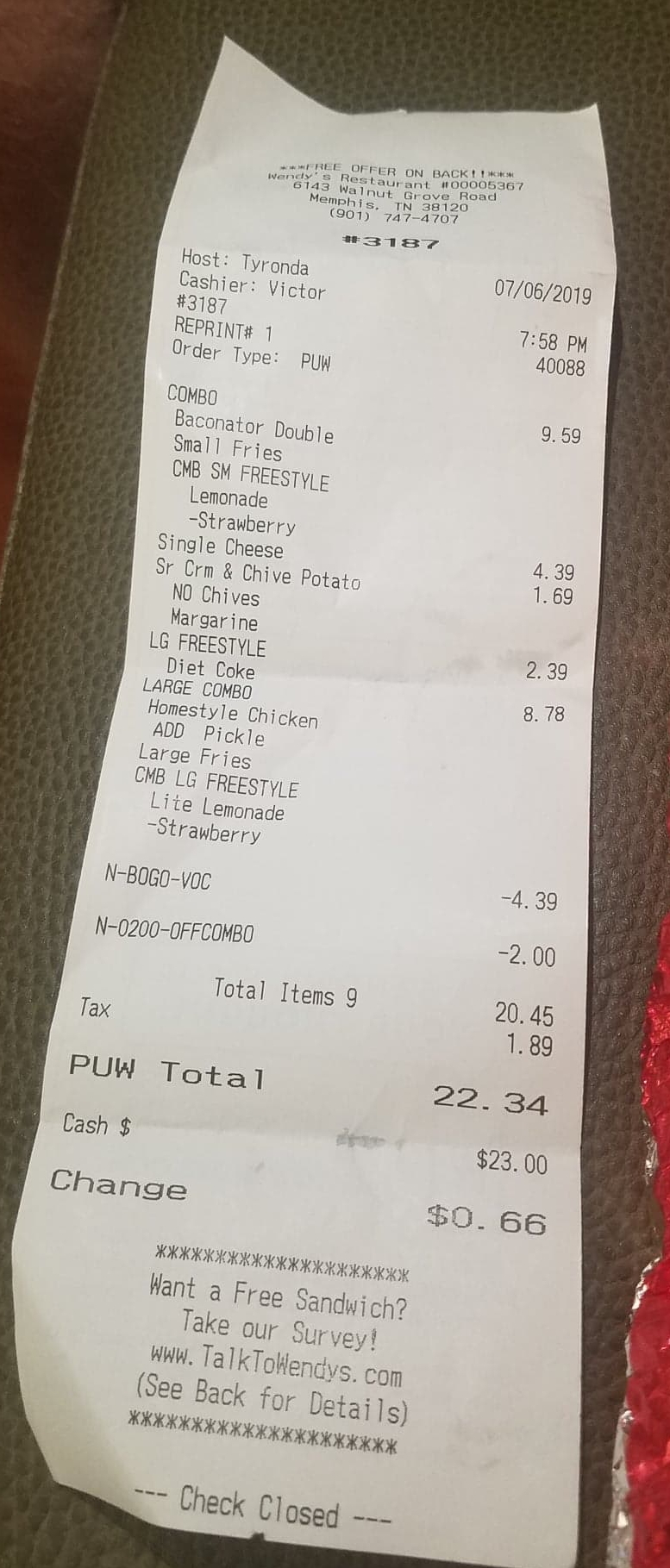 Worst attitudes, terrible service, disgusting food & on top of that they robbed us for about $6 by entering coupons & trying to refuse giving me my receipt. They gave me a receipt from somone elses order first but I had to go in to tell them they left out part of my food. They under rang the drinks & fries but gave us the bigger sizes we ordered. I was told $29.34 & gave $30 in cash, then received 66 cents back. On the 3rd attempt to get a receipt I finally got the correct one, it stated a lower price & had discounts and coupons I did not add. This wendys & their employees robbed me and kept the money. Gave us the worst food ive ever tasted in my life & got angry with me when I continued to request my receipt & food. I would call the police, but seriously what would that get done. I was visiting family at Baptist Memorial, wanted something quick. Dont go to this wendys without protection or a desire to be robbed with a smile. Ive included pics of the receipt, the disgusting food we could not eat and the 3 large drinks we ordered. Yall check the receipt, I ordered:
