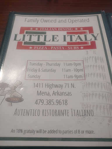 Read moreIt's Sunday in Mena which means there are only 4 restaurants open after 4pm. Bummer. We decided to give Little Italy another shot after last time not being too pleased. Today's dinner was awesome! Husband had the steak and shrimp, I got the tour of Italy with diablo sauce instead of regular marinara. Our dinner salads were excellent. The steak was perfectly seasoned and cooked. The shrimp...was the best shrimp I've ever had. The smell was mouth watering. Whatever they're doing to those shrimp should be how every restaurant prepares them. My pastas were fabulous. Excellent flavor of both sauces. The diablo was to die for. chef kiss the lasagna....could have been better. But the other two pastas made up for it. We both have leftovers for lunch tomorrow and will go back again. Great job!