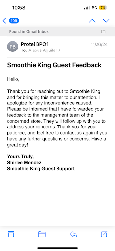 3 stars because Iāve done numerous of the receipt surveys over a month ago and the store manager still hasnāt contacted me. I followed up with support, they said they reached back out, still nothing. 1 drink was done 9 minutes after the promise time, another drink tasted very bitter because of the coffee, been charged a few times for substitutions when I shouldnāt have been. Iāll just have to dispute with my credit card company since...
