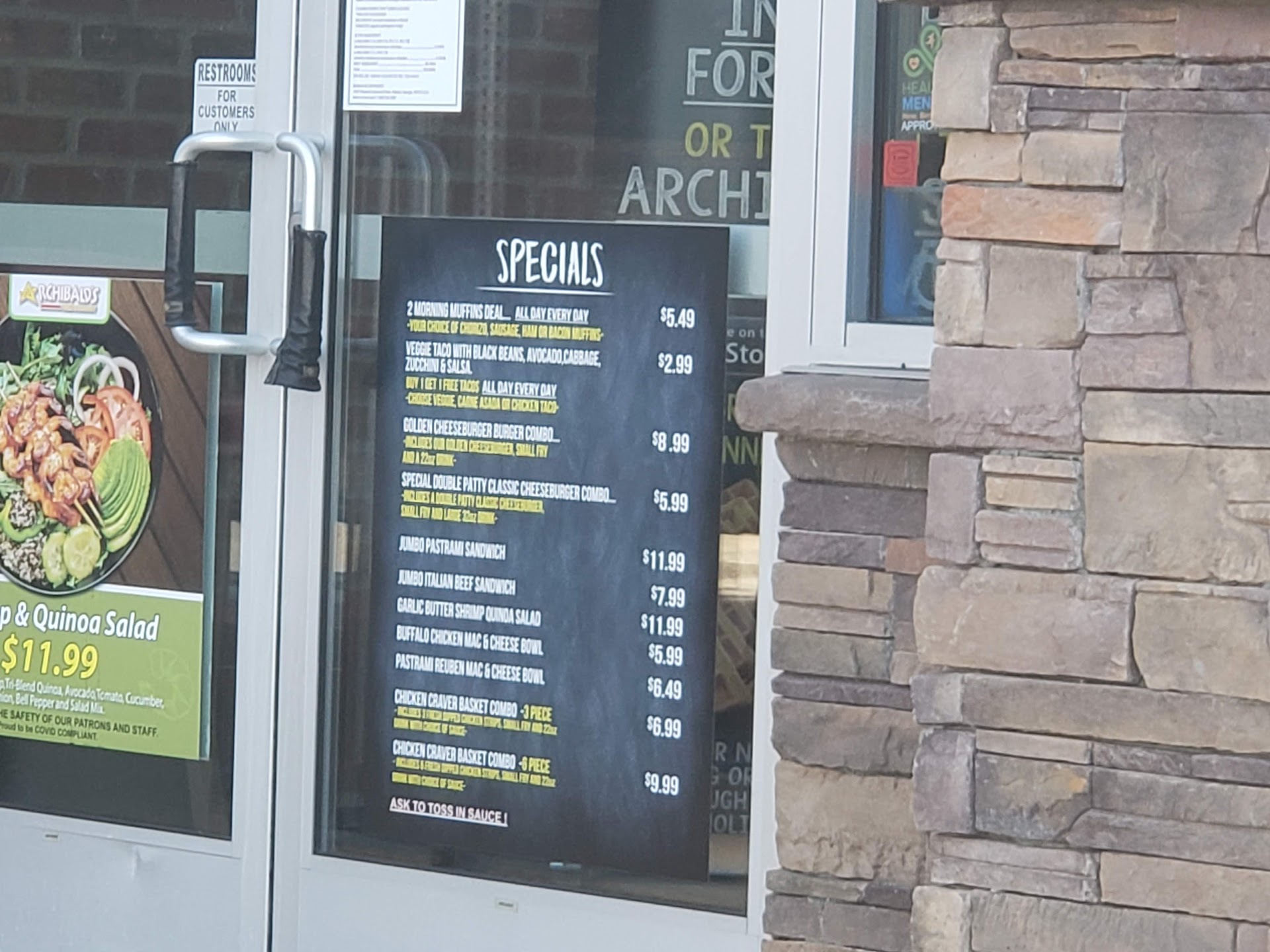Archibald’s Drive-Thru is quite the name, almost indicates that the bulk of their operation takes place through the drive up window. Considering that the inside of the place is quite impressive, and quite large. Large TV’s playing sport events, and a nice stereo playing rather cool tunes. This place probably sits quite a crowd. When I entered it was around 8:30 PM, and the place was empty, the big place all to myself. I also did not see any vehicles on the drive-thru. Not an auspicious introduction to Archibald’s. I think the name caught me, and the fact I never tried their food. Archibald’s is like a jack of all trades, with breakfast to hot dogs, to pastrami and their supposedly well appreciated burgers, and throw in Mexican fare, chicken wings, cold beer, a couple of gyros, chili, and a few desserts, etc. I ordered the Monster Burger, $7.89 before taxes. Came with avocado, tomato, lettuce, bacon, two hamburger patties, pickles, mayo, bun. Bun old, started breaking apart on its own, very mediocre quality. Meat dry and immediately regrettable. Bacon, some properly cooked, some almost tasted raw. My goodness, so big but so sad, too late by now. Can’t turn back the clock! 2 Stars. Next blunder: Burrito with Carne Asada, $7.79 plus tax. Their Mexican side did not deserve Mariachi music. Burrito filled with its own particular kind of retried beans. I think some rice was involved, and as far as the Carne Asada goes, like the old lady from the Burger King commercial: Where is the Beef!? Scandalous business practice, that several food places practice: they give you a fat burrito, but no more than 10 or 15 percent of meat. Carne Asada pre cooked, bland and cut in tiny pieces, no solid display of quality here, just a baboon of a burrito. What made it even worst was their salsa bar. Their Pico de Gallo version stale, not very appetizing. 2 Stars. Desauri? manager appeal, nice and helpful so she gets an additional ⭐️. Place looked good and clean, final bill almost $18. Archibald’s did not serve tasty...