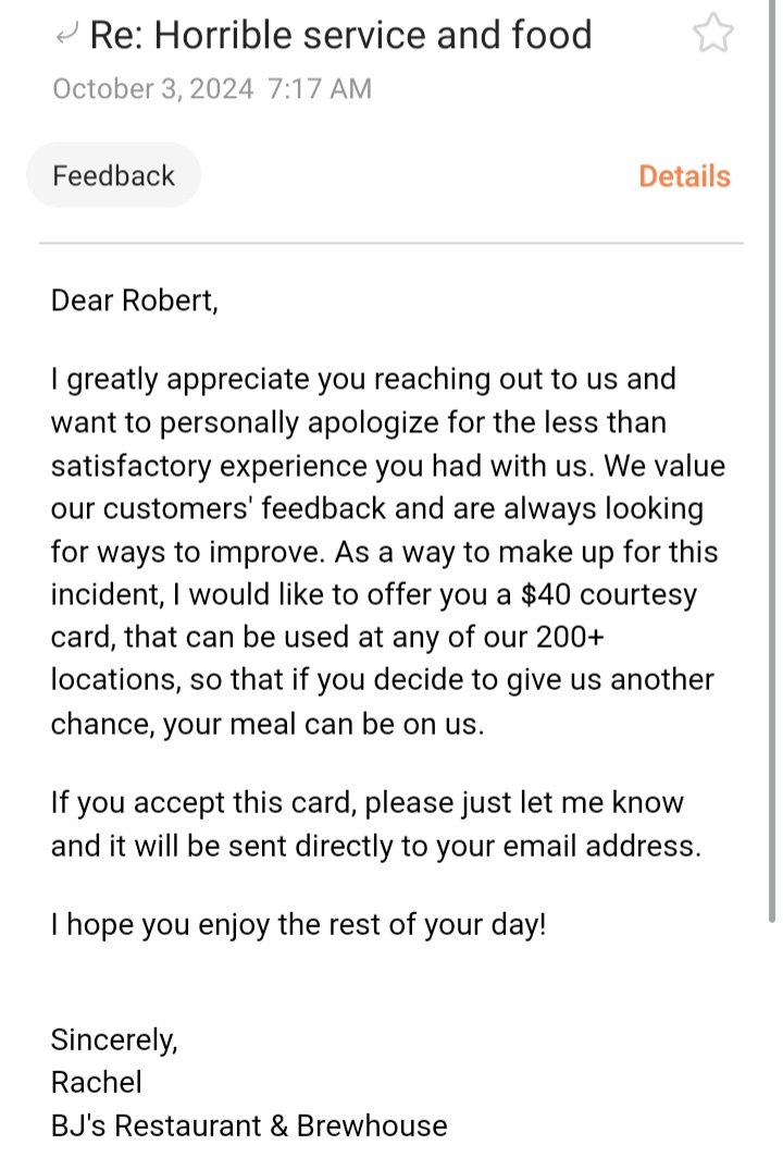 Updated* Added a picture from email I received back from Rachel, she doesn't care and offered a $40 credit to go back for more crappy service and food. Shame on you BJ's.. go to red...