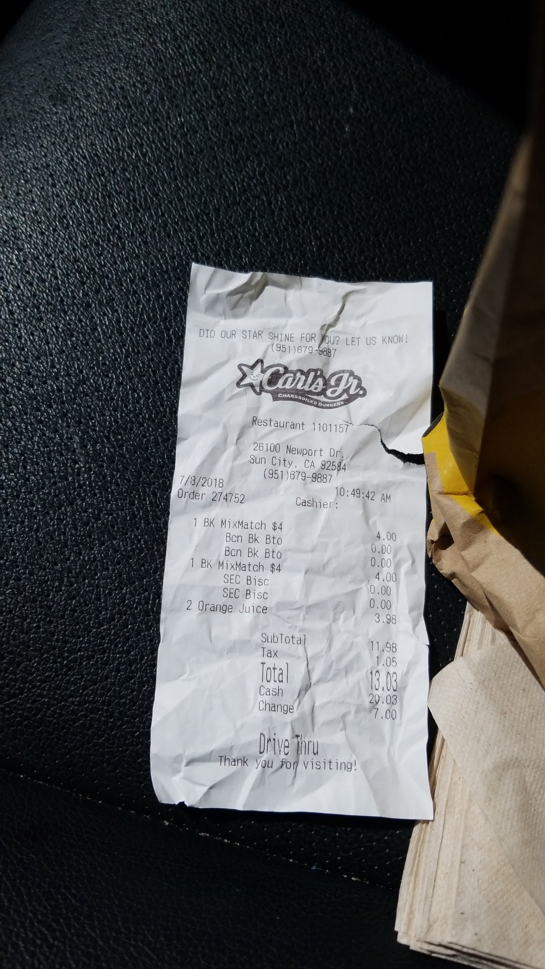 Read moreCame in for a quick bite to eat. Got the barbeque chicken sandwich and crosscut fries. My wife got a regular jumbo hamburger. Food came fast and I thought it was a bit too fast and I understood why. The fries were like they used motor oil to cook them in. Dark brown and smelled really harsh. They tasted like you'd imagine a used valve cover gasket would taste like. I promptly returned them to the counter and was offered an exchange (using the same disgusting oil) or get regular fries (apparently from different oil vat). So I got those instead (didn't get reimbursed the difference in price though), not even an apology actually but that's ok. place was nice and clean, smelled okay, not busy so I don't understand the not Changing the oil part. C'mon guys. There's plenty of parking. Well lit and in a decent area. Prices are as Carles Junior always are ... Expensive. At least to me they are. Yeah it's worth going here. Just watch out for dirty old...