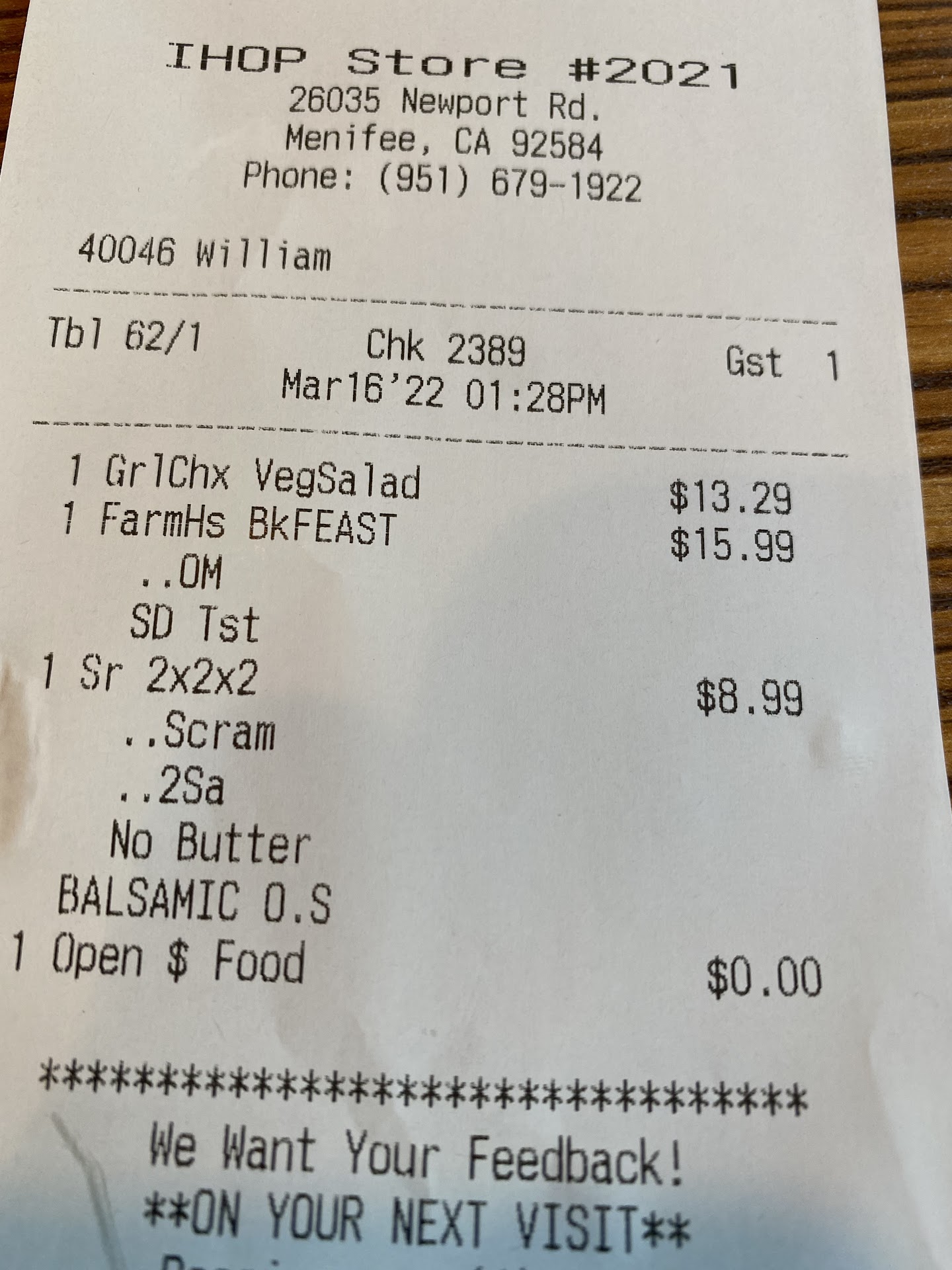 Read moreIHOP has a long tradition, or should I say existence? In the past if my memory does not fail me, their food in general was definitely better. Today, after insisting on the part of the ladies in the family, I returned after many years hiatus I returned but I would not say triumphantly, for the food left quite a bit to be desired. I do not blame the after effects of the pandemic, or even the pandemic when in force for the lack of culinary skills on the part of the cooking crew, or even the quality of ingredients used, for I strongly believe in those who want and know how to deliver good fare. Service was prompt and accommodating throughout. Food: Grilled Chicken VegSalad, $13.29. Lady who ordered it liked it very much with Balsamic dressing. Nice serving, carried half back home. 4 Stars. Farmer Hot Sampler Breakfast Feast?, $15.99. This is where the boat started taking in water. Big and link Sausages, nice amount. 1 strip smoked bacon. A couple of pieces of ham. Two eggs over medium, Sourdough toast, 2 Pancakes, that truly have lost all appeal regardless of how much butter and syrup used to help. Really sad for once upon a time this was their stellar choice, many recipes ago. All the meat sweating with oil/grease (whichever sounds nicer), flavor average at best, mediocre at worst. Not a pretty sight, bite. 2.5 Stars. Seniors Scrambled Eggs, 2 Sausage links, 2 pancakes. Our lovely senior eats like a lumberjack but in actuality is a 120 lbs beauty. No pauses until plate is consumed absolutely. 3.5 Stars. Total with gratuity was dangerously close to big 50. I’m sure they have plenty of items the fine customers enjoy, but I give this...