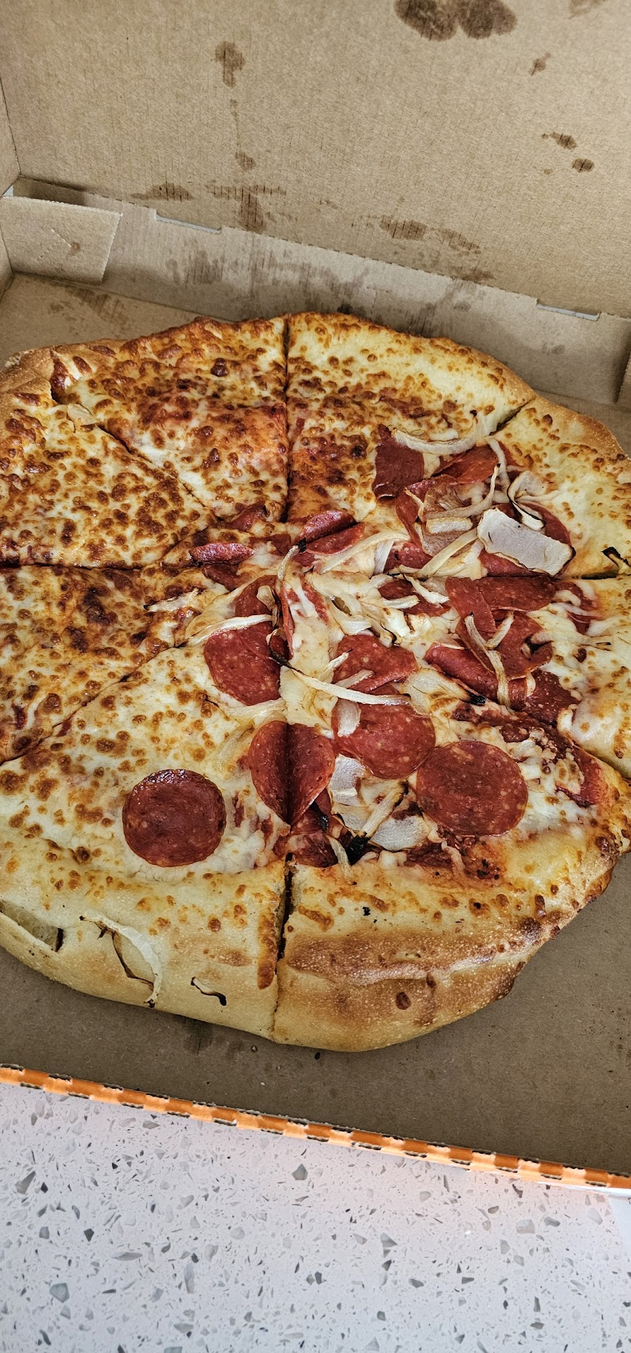 Read moreI usually don't critique most food places since I'm a grab and go customer who usually buys whatever is the special. However, going to this location ruined my appetite. I ordered the front page special for 7.99 at 6:26pm on a Saturday night. Website said it would be ready 6:56-7:01. Walked into the store at 6:56 exactly so they wouldn't skip me like previous times. I wait in line a little over 10 mins and he tells me they are just now loading it into the oven. 20 minutes later a woman decides to write down the names of people waiting for pizza after a guy complains he's been waiting there an hour since he first ordered (4 pizzas + dipping sauce). After collecting 6 names, i yell my name and she turns around and walks to the back, not even surveying the crowd and acting like she is being rushed even though no one is being pushing including the manager in the back. She comes back after looking for 4 orders(multiple pizzas) to bring up (all multiples pizzas) then asks again for names of people waiting on orders only to take 1 name (not including me and the person next to me that also heard me yell and felt sorry) and runs on back to look for more orders (Again, no one is rushing her to search for their orders). Then she asks if anyone wants to START a new order AND that it would be ready in 30 mins (despite over an hour wait time on a single pizza order). Finally my car passenger comes in wondering why it's almost been an hour. And I say the front desk lady is trying hard to avoid looking for my order (the one pizza). She looks at me and asks why I haven't been yelling, to which I know is obvious bait to get an emotional reaction. I tell her she, "walks away every time I give my name", while she decides mid sentence to turn around and look for more orders. She comes back AGAIN and asks my name (which I have now given 3 times). She says "I think I saw that one" as if rubbing in the fact that she is ignoring smaller orders (They yelled out the name of a double order of the 8 dollar deep dish). I also am not wearing a mask, thus not muffling my voice when speaking to her. She says "I need to get the sauce" as if that is not already standard for the Caesars special and readily available. She comes back at 7:46pm with my pizza without any condolence. That means my one pizza was cooking for 40 minutes and that my order from placement to received was 80 minutes LONG. ONE PIZZA, EIGHTY MINUTES, NO...