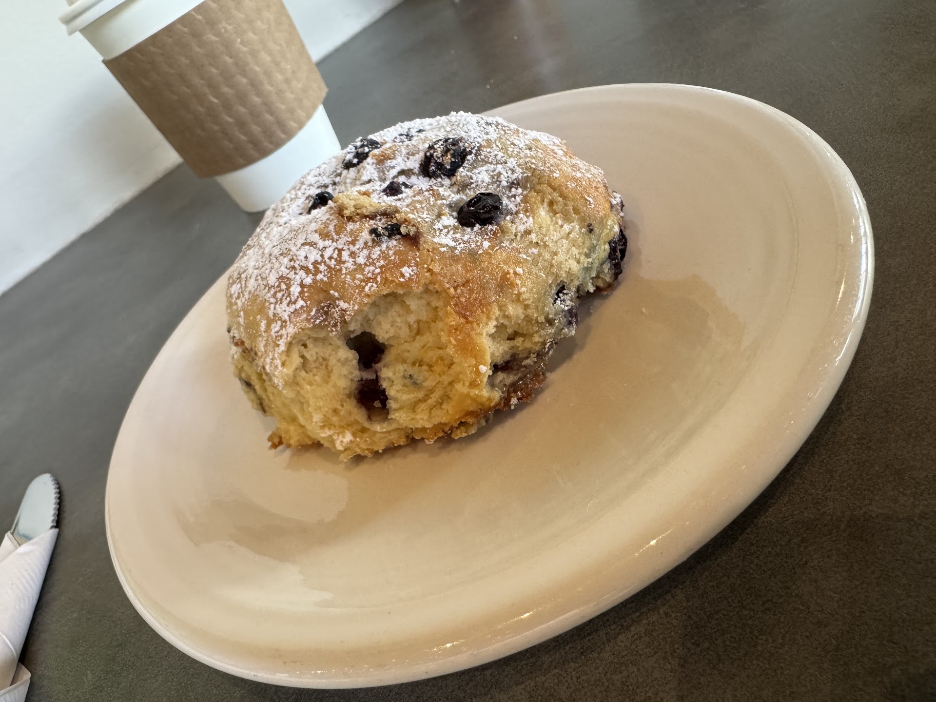 He was so nice, knowledgeable and helpful...I knew I wanted a scramble and a latte, but I also knew I wanted something else. I thought about a side of toast but this smart guy talked me into a pastry. I asked which one was his favorite because there were so many good ones to choose from...I couldn't decide. He said the blueberry biscuit was his favorite and I said "okay...I'll have one of those".