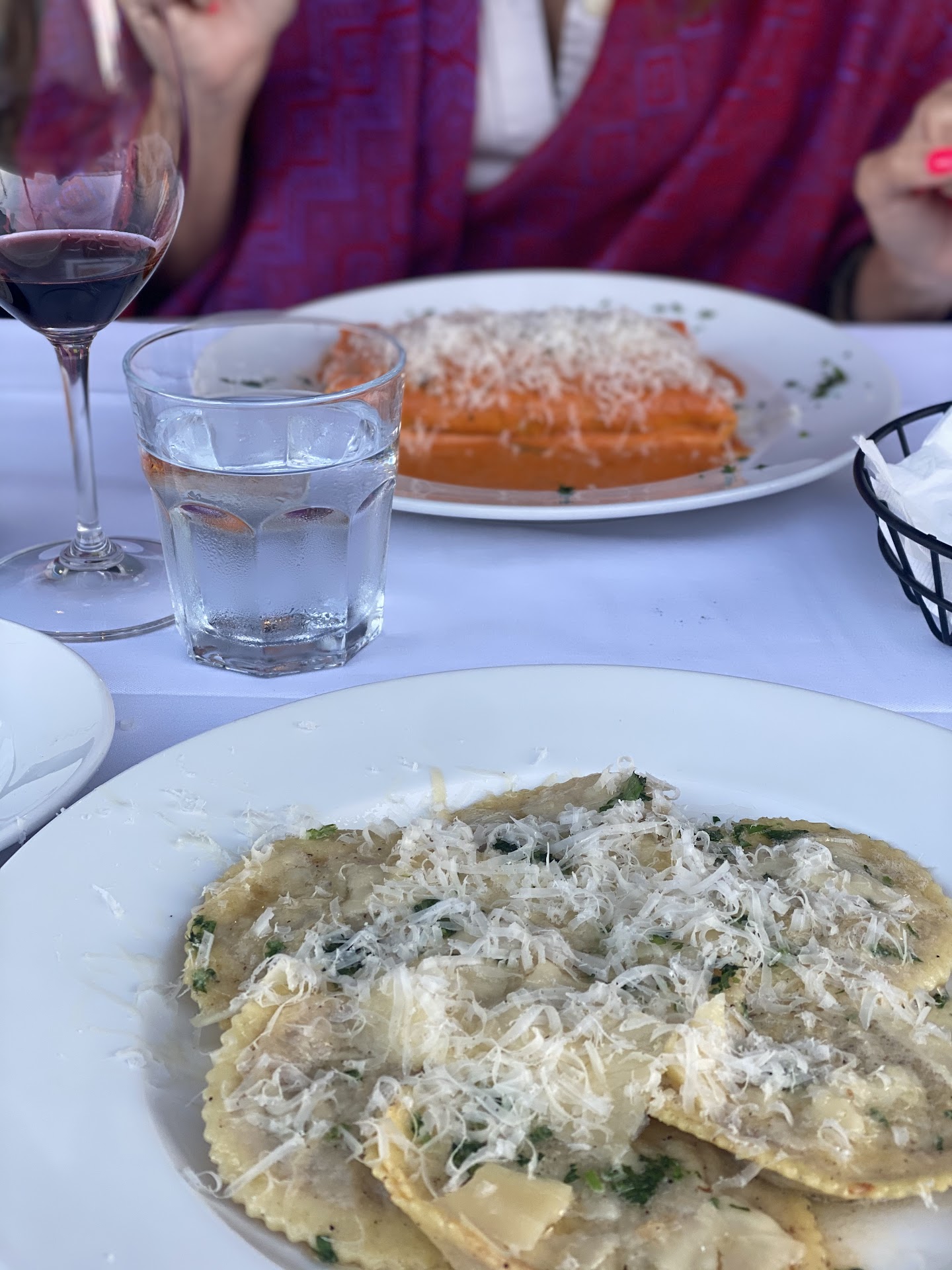 Main Dishes: Fiocchetti con Pere ($15) & Fettuccine con gamberi ($17) On the menu "Fiocchetti con Pere" is described as "homemade ribbons pasta filled with cheese, pear and gorgonzola sauce" and is apparently the restaurant's signature dish. We went with our server's recommendation and ordered this; however, she mentioned that it did not have pear in it. I'm not sure if they ran out of pear or changed the recipe but we were not given an explanation. Hopefully they will have it with pear next time we visit. Still, it was very delicious. I am not a huge cheese person so my boyfriend finished the dish for me and I ate his Fettuccine con Gamberi which was also quite tasty.