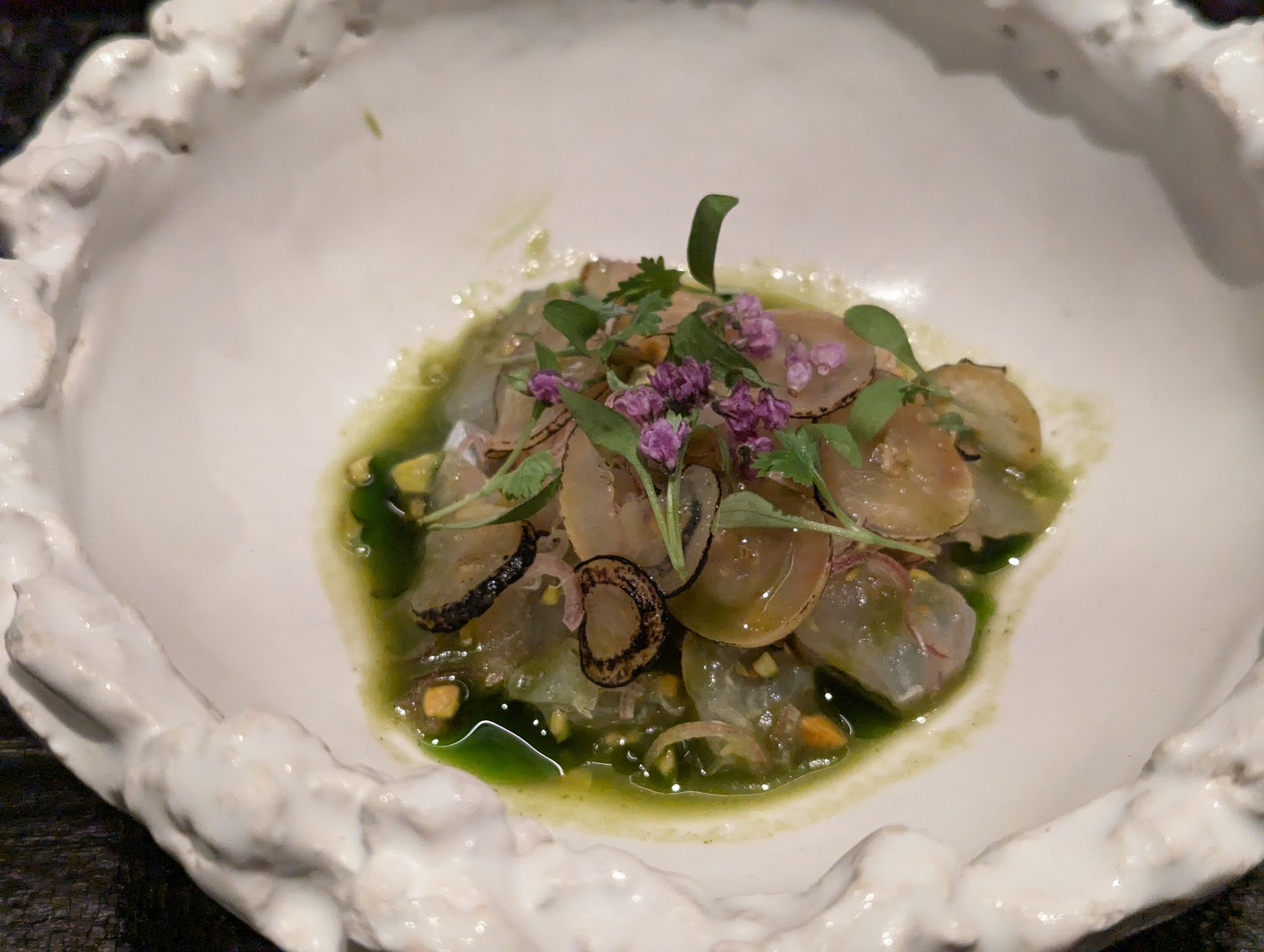 Came here a couple of nights ago with my spouse and some friends. It was a little difficult to find the place and it's not well marked but I'm not taking points off for that as several other high end restaurants like to be low key. The interior is pretty dark with some spot lights over each table. It was a bit funky in terms of design but still nice. They were pretty much blasting 00's hip hop music that was really a couple dials too loud. We could still talk with each other but the music was very present in our conversations. We were maybe the 4th group there so the restaurant was relatively empty, which was a bit puzzling since then only available appointments were 5 pm or starting at 7:30.
