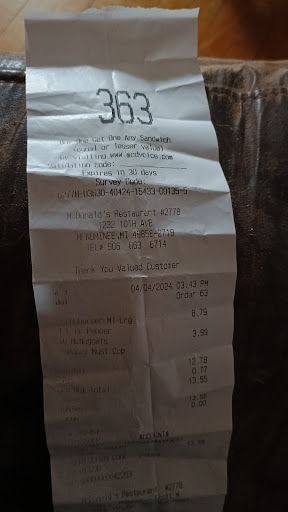 Read moreWaited at their 3rd drive thru window for 15 minutes while waiting for 3 items. They were parking everyone in the drive thru. I get it, busy. However, all of the people that ordered AFTER me were getting their food before me. ALL OF THEM. When I called to ask what was going on, I was told they were waiting on the fish I ordered. For 15 minutes? Don't think so. I worked here when I was younger and I know how long it takes to make one and it's not 15 minutes. When I FINALLY got my order, the kid apologized and said they put an apple pie in for the wait. Went to eat said apple pie and it was very obvious it had been sitting around a LONG TIME. Hard as a rock and not much filling, exactly what happens to one when it sits forever in a warmer. So thanks but no thanks McDonald's in Menominee. Worst experience I've had there...