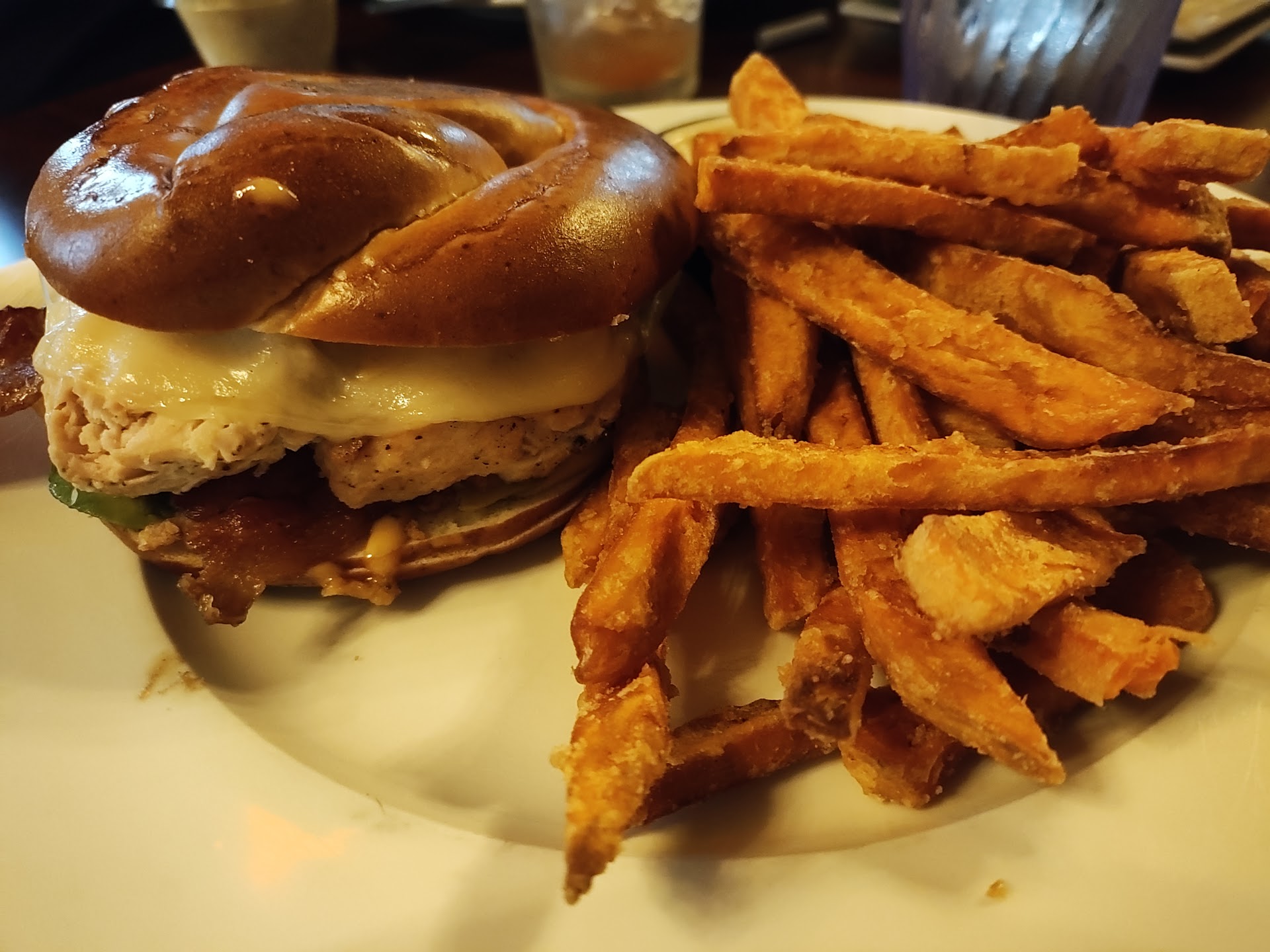 The food is delicious. Our group ordered the Friday Fish Fry Perch Dinner, Salmon Sliders, Citrus Dill Salmon, and I had The Number 4 with Sweet Potato Fries and Maple Mustard Dipping Sauce. Everyone had only good things to say about their choices. The Number Four is a delicious combination of "Grilled chicken breast, chipotle mayo, avocado, bacon, provolone, and French's Fried Onions. Grilled on a salted pretzel bun." (that's copied right off the menu). Let me say the flavor combination is just delicious. But the ingredients also make it quite slippery, magnified by the chewiness of the pretzel bun. I don't recommend changes because it would spoil the flavor profile, however if you order it, ask for a steak knife right away and eat it as it were a steak. Doesn't detract from the flavor, but will make it MUCH easier to consume. We also tried a few of their desserts. The ones ordered were Flourless Chocolate Cake, a peanut butter pie? cake? And I hand the Mint Brownie. We all loved them. The flourless chocolate cake was noted as being very rich, but very delicious. The peanut butter dessert has a topping that was described as being like the inside of a Reese's peanut butter cup. I had the mint brownie. SO good. Reminiscent of Andes Candies. The mint is light, yet not so scarce that you don't...