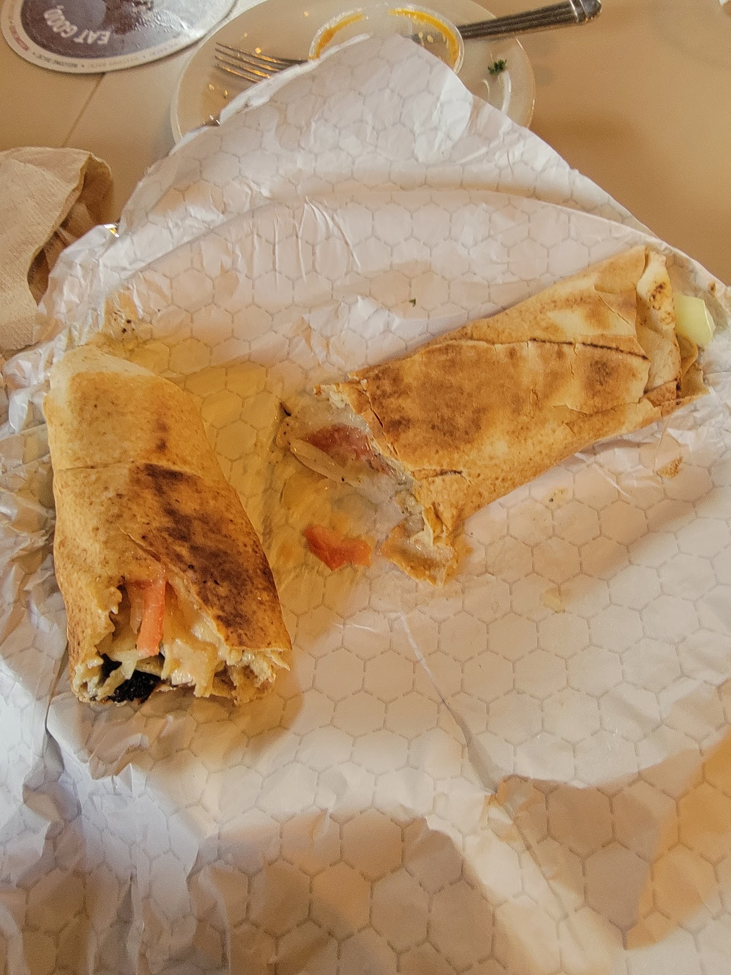 Appetizers began with hummus, the entry level appetizer that sets the dining experience. What a delicious treat! The right ratio of chickpeas and tahini topped with olive oil and spices. A fresh slice of tomato and cucumber. Wonderful to dip pita in this. Next was an order of Sfiha. This was a scrumptious dish of sautéed lean ground beef, lightly fried pine nuts, onions, tomatoes, and herbs folded into a pita pie and topped with cheddar and scallions. We had to pace ourselves to save room for our main courses.
