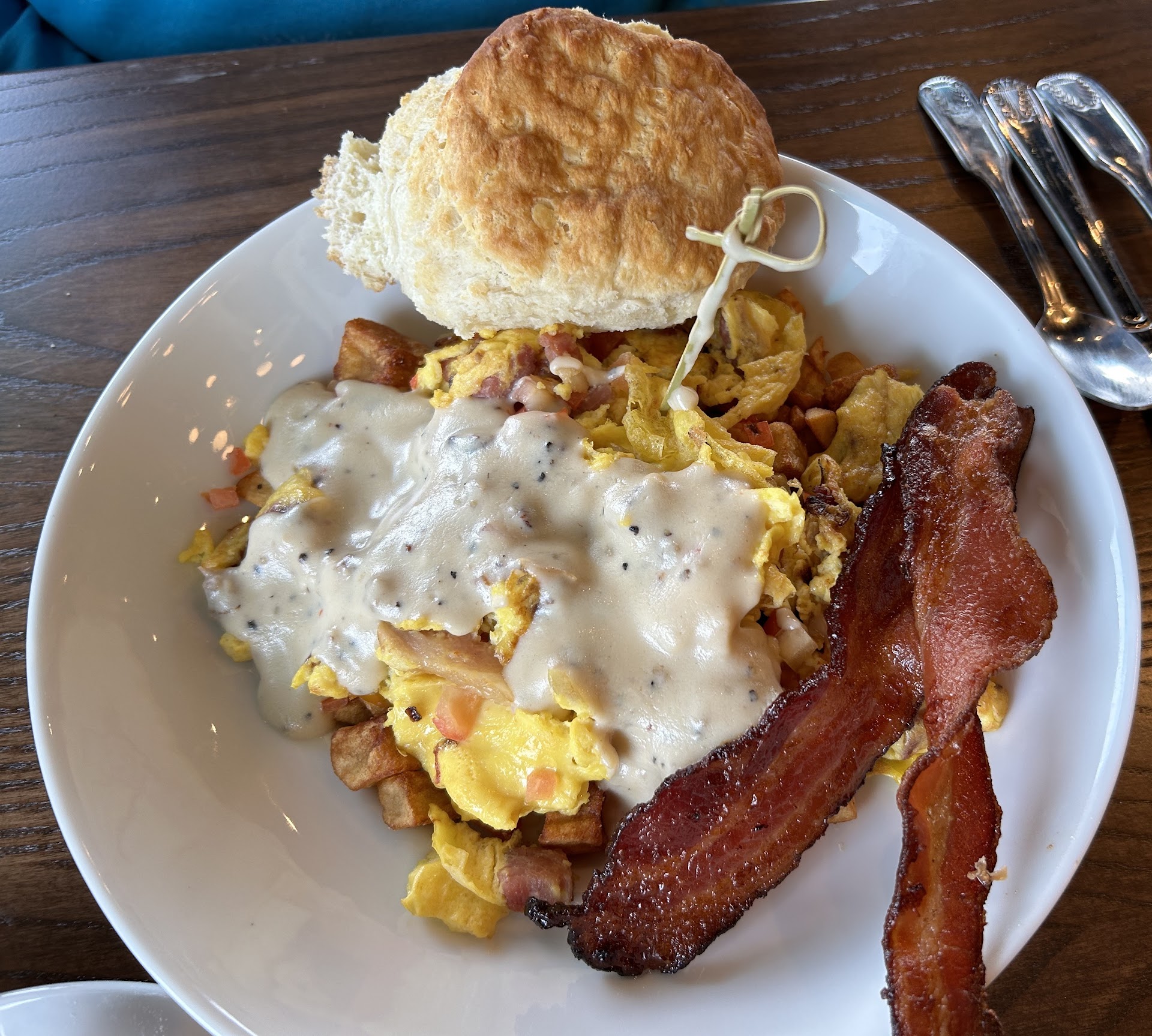 One of us ordered the country power bowl ($14.99). It had everything but the kitchen sink in (country ham, onions, cheese and tomatoes, and topped with sausage gravy) and served with bacon and a gigantic biscuit. It was served on cheddar Jack cheesy grits or potatoes. It was a huge portion. Enough for 1 or 2 more meals.
