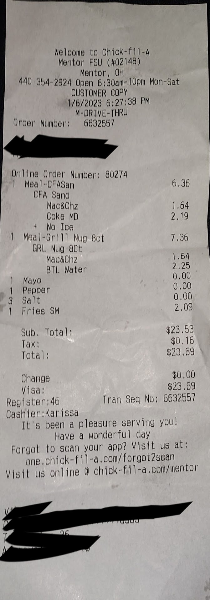 Finally today, I ordered breakfast through the mobile app for pickup at 9:50am and sent my partner to the restaurant to pick up the food. He arrived around 10:05am to find the restaurant completely closed with a sign on the door saying that they were opening at 10:30am due to the snow (the roads in this area are already clear though I acknowledge those coming from outside of town might not have clear roads). The mobile app had already marked him as arrived with no way to cancel the order and so he sat there for 25 minutes until they opened the doors. When he notified the cashier of the situation they told him that they would not make our order, the best they could do was complete a refund or make a lunch meal instead. When he asked why we were able to place the order through the app when they weren't even open, he was told that they forgot to close the orders through the app. The quality of this location has gone steeply downhill since they reopened after renovations and I will not be visiting the Mentor Chick-fil-A again. I would rather drive the extra 25 minutes to the Willoughby location which is much friendlier and...