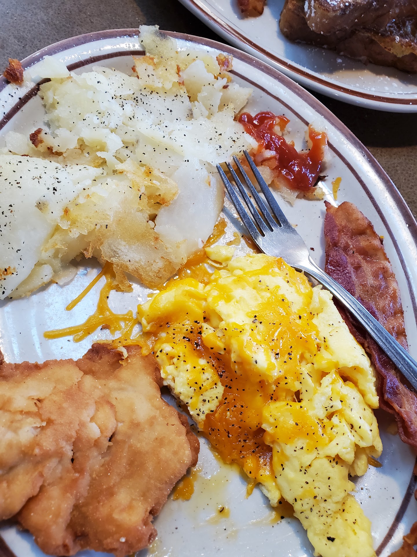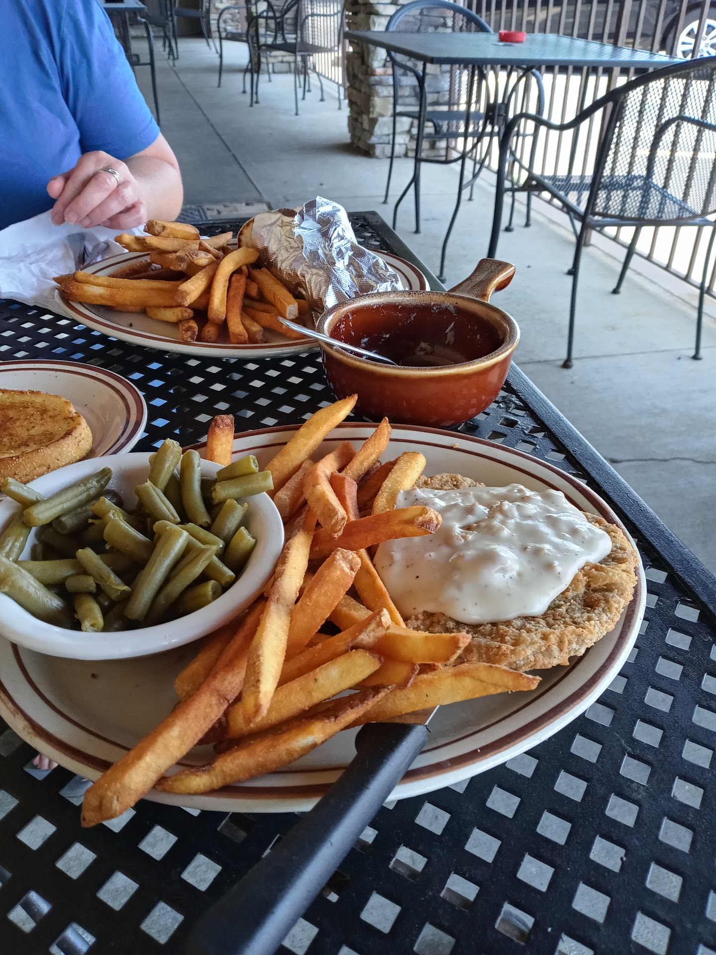 Read moreMy husband and I stopped here around noon on a Tuesday and there was no wait for a table. We had never been, and wanted to try it. Our server was friendly, but must have had a large section because it took her a while to get to us to take our orders. I got the salad bar and the battered fish dinner. It was just okay. The fish is like frozen fillets that were fried, and were greasy with some parts that had a weird texture. The French fries were standard, the green beans were literally canned green beans microwaved and put in a bowl (no butter, no salt or seasoning), and the salad bar was sub par. They have a very basic selection, and the soups were nothing fancy. I do not recommend getting the salad bar only for your meal, it's not very substantial. My husband got the breakfast, biscuits and gravy, eggs, sausage patties, home fries. He said it was good, but the server forgot to bring him his sausage patty and instead he got extra gravy. We asked her for the patty and instead she came back with the roll I was supposed to get with my dinner. She did finally bring the sausage but my husband was waiting for 5-10 minutes to eat the rest of his breakfast. I felt like tables around us got more attention, and it wasn't like there was a wait for tables. There were empty ones around us. I would try it again, but would get something different, maybe breakfast. It's not anything to scream about, but is an option for breakfast,...