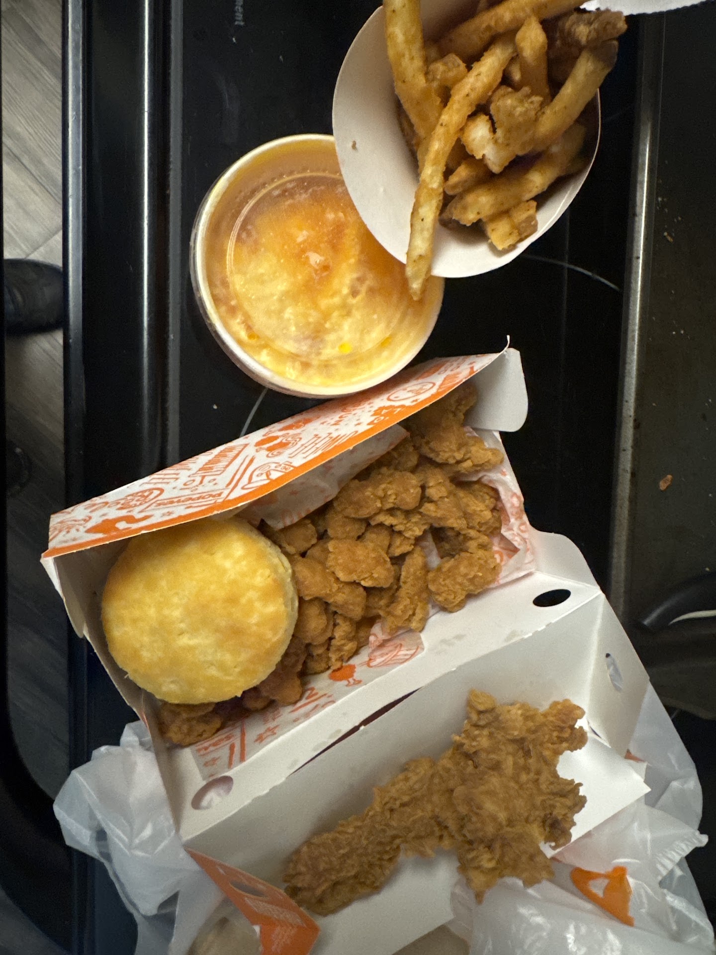 1st time visiting a Popeye franchise. Excited to try their chicken as I had heard positive reviews about their recipe and theres always a line of cars around the building and parking spaces are full. Went to drive through and this location was not busy...hardly anyone there on a thursday afternoonat 3:30. Two of us in party. My husband ordered a #3 combo but they were out of the chicken so he requested a #2 combo instead with Cole slaw and a d coke. A basket of the butterflied shrimp but they were out of the butterflied shrimp so we opted for the popcorn shrimp instead. A 12 piece wings basket, a mango lemonade, and 2 oreo cheesecakes. Our total was $28.33. The restaurant wasn't busy at all. After we paid for our order we received one of our drinks and were asked to pull ahead and she'd bring our order out. We waited for about 15 mins when my husband went inside to inquire on the status of our order. While he was waiting for help the lady came out with our order all bagged up and handed it to me. As I placed the order on the passenger seat of my car she explained that they were also out of Cole slaw so I told her that my husband would like mashed potatoes instead. I also told her that he was inside trying to find out on our order and just then he must have heard his name and started walking to the car. We waited a few more minutes for the mashed potatoes and then left to go on our next errand. When we got home and unpacked the bag of food they had not given us our oreo cheesecakes. I tried calling the number listed on Google for this location a few times and both times went to message stating that this number isn't taking calls and has not set up a vm and to try again later. My husband enjoyed his food. We both liked the popcorn shrimp and fries. My wings were terribly spicy hot so I didn't like them or finish them and I could hardly taste any mango in my lemonade but maybe my tongue was just flaming on the wings. Now I know what Popeyes Chicken is like. Hopefully you have a better experience...