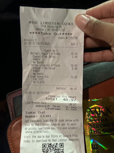Read moreMy wife and I visited the Mentor location with family for a Birthday celebration. 🥳 🎉 The amount of food My granddaughter and stepdaughter got was more than they could eat in one sitting. I am Surprised Red Lobster doesn't expand the Kids menu to those over 60 and those trying to lose weight. Kind of like a value menu. More people in the door is always a good thing! My wife ordered the crunch fried shrimp.🍤 and I got the Fish and Chips with Fries and Hush Puppies and The Cole slaw! The Fish came out hot and had a most delectable batter. Really Crunchy! It was extra crispy and the fries hot and delicious! The Hush Puppies were a new offering. They come with a Honey Butter. They are about ping pong ball size and dip into the Honey butter. Never was a fan of Hush Puppies, with the Honey 🧈 butter they're better than the fast food version. Still not a fan, but I tried them. Never did get my Cole Slaw but forgot to say anything. Joshua kept us in refills and cheddar bay biscuits despite his many lunchtime customers. My wife likes her cold food cold and her hot food hot. Her only complaint was her popcorn shrimp was not peeled to her satisfaction and still had the tails on. She told out server Joshua C. and he replied "that's the way they come now". Brittani helped Joshua and served our Lunch piping hot. Overall, service great, good food and served hot! About $120 for our Birthday Celebration with 3 adults and a child with tax and tip. The Birthday Desert was complementary with a downloading of the Red Lobster 🦞 rewards app! Still a good place to...