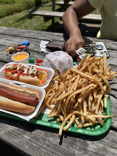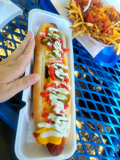 Read moreWe got the flame dog, and I will say, not as spicy as we thought it would be. The hot dog though is delicious, and to be honest, it is great on its own without all the extra things, but it's fun to see all different ways they can create a meal out of a hot dog. Also, look at how big that home wrecker dog is! Fills you up! The fries were good, and I was really looking forward to the chili cheese fries, but the chili part did let me down. It was more tomato than anything. The ice cream 👍 I got birthday cake, which is my favorite flavor, and it delivered. SO GOOD! I suggest going on a nice day that you can sit outside. They are tiny inside and not much seating on the inside, but they have a lot of picnic tables all around the building outside to sit. They were SUPER busy even on a Thursday evening during summertime, but they are very quick. I didn't mind standing in the line that went outside. They have menus posted on the wall when you 1st open the door. I suggest taking a picture and deciding while you wait to you know what you want when you get to the register. Pepsi products, so sorry Coke fans. They also have bottled water, bottled iced tea, and I got a bottle diet Dr pepper since I don't like Pepsi. You'll find something to drink. Will I visit again? Absolutely! With all those options, I need to try another. 2 flame dog home wreckers, 1 large chili cheese fry, 2 scoop birthday cake ice came...