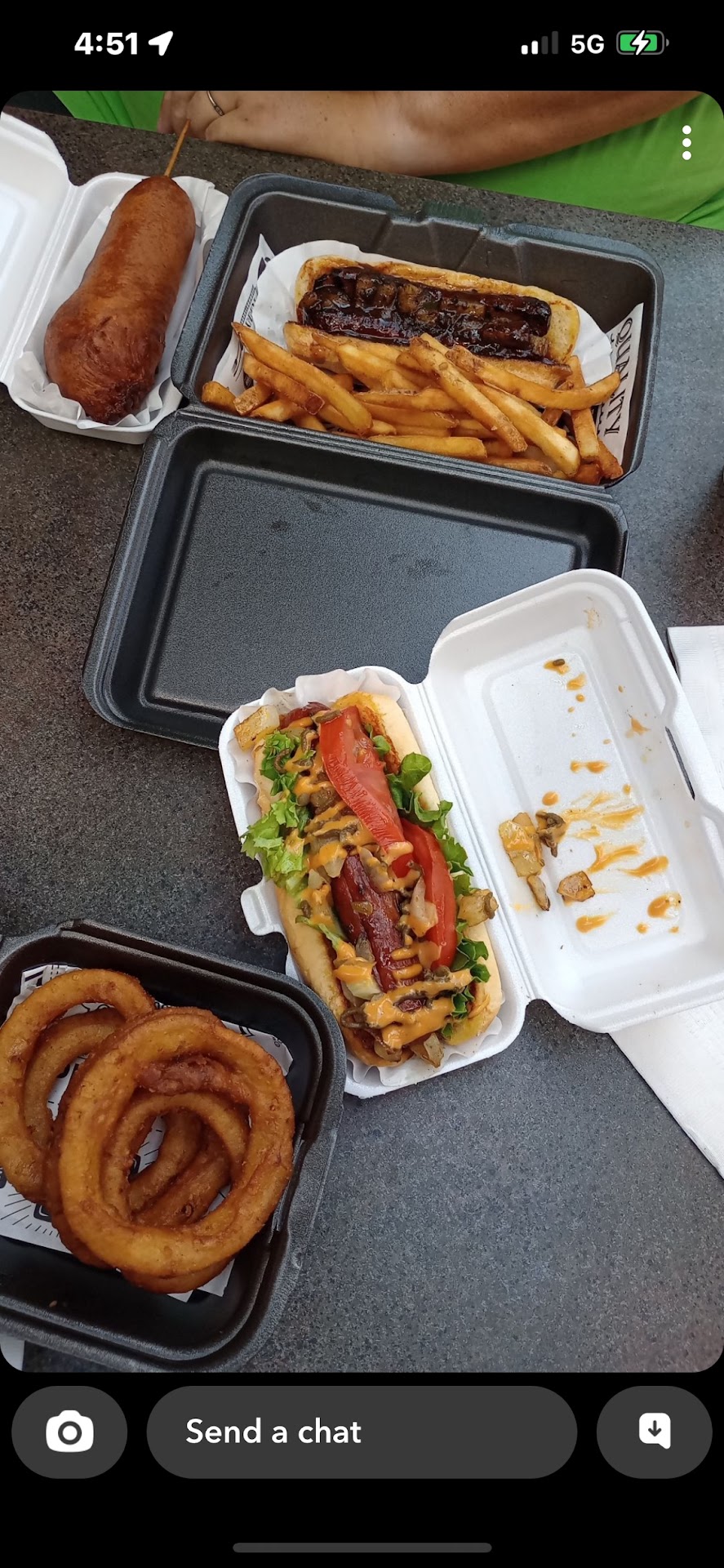 07/07/24. Saw this place reviewed on TikTok and thought we’d give it a try. It was mediocre at best. I tried the Jamaican Dog (3.5). A regular corn dog (4.2) and fries ordered extra crispy. They were not. The sauce on the jerk hot dog was overwhelming and was drowning everything and made it over all a soggy mess. The corn dog was cold in the middle and the fries were a let down. Tiff got a California hot dog (4.9) onion rings (8.2) and a corn dog. It was grey in the middle ( as if it were old) by far the best item ordered. And her corn dog was to cold in middle. Overall experience 4.8. For us we will not return. If they fixed a few things it could be really good. The various combinations they offer sound amazing. They just don’t execute the final product....