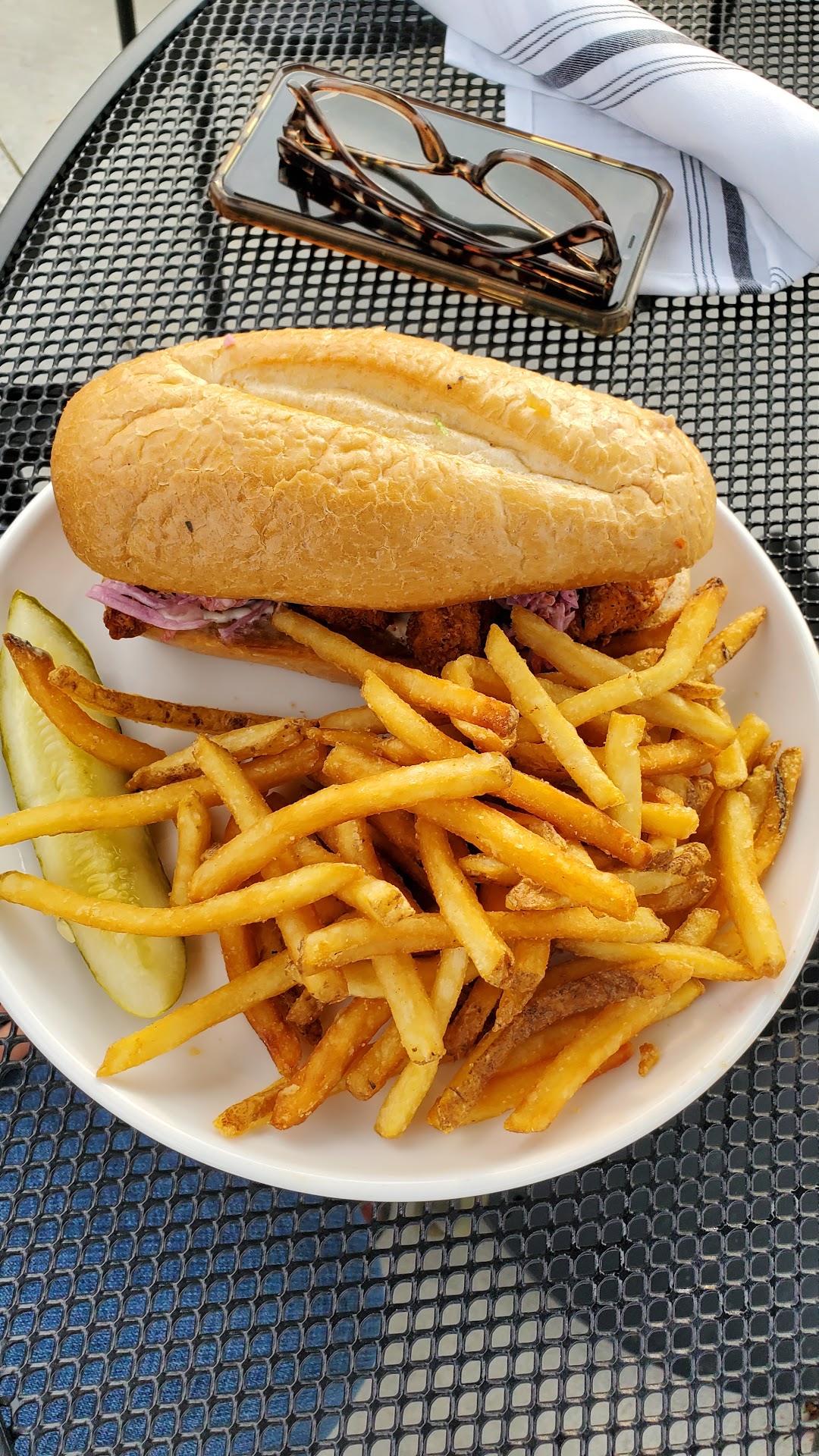 The sandwich was called Sauerbraten Bahn Mi. German and Vietnamese together. The meat is very good. Tender and great flavor. The sauerbraten flavor is strong but not overwhelming. Good balance. The cabbage is fresh and crispy. It is not bitter, which is good. The sauce fits in the mix well. The French roll is soft and does not flake off as I bite into it. That is refreshing as I don't like dried out bread. There is a little crisp dried out toast at the edges, but very little so it is acceptable. As I reached the other end of it, the sauce was thin and had spilled out into the plate. That made the bread wet and messy on the bottom. Not terribly. Just something to watch out for.