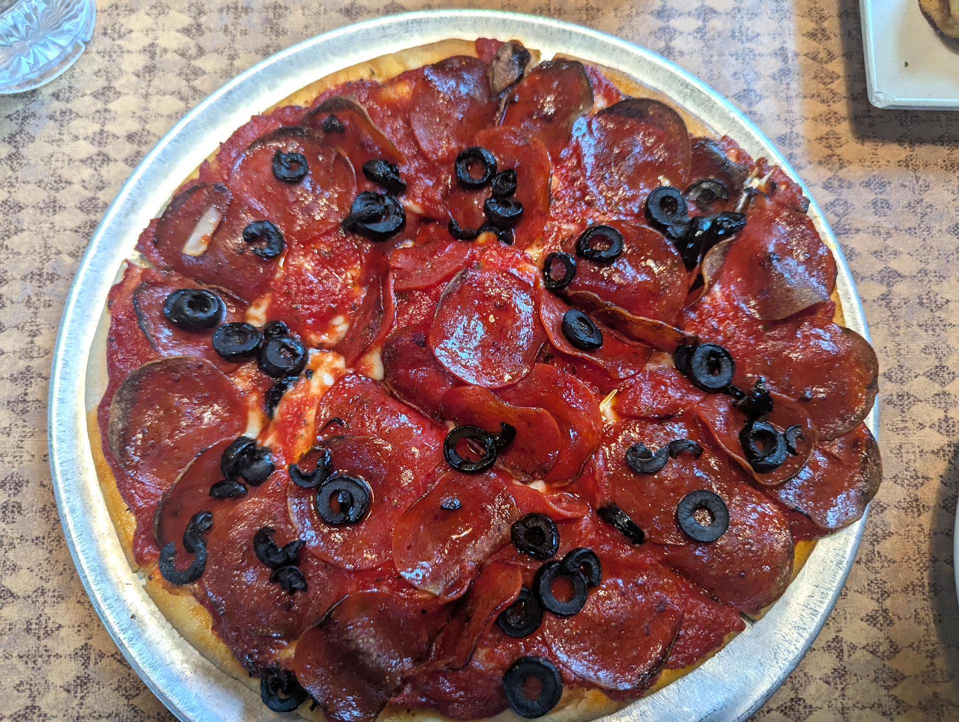 The real surprise was the pizza. The thin crust was crispy and toppings flavorful, but the sauce was the star of the show.. It has a slightly salty/sweet flavor that is completely unique and balanced with the toppings very well. With the grated cheese provided on the table (Romano, I think), it was fantastic.