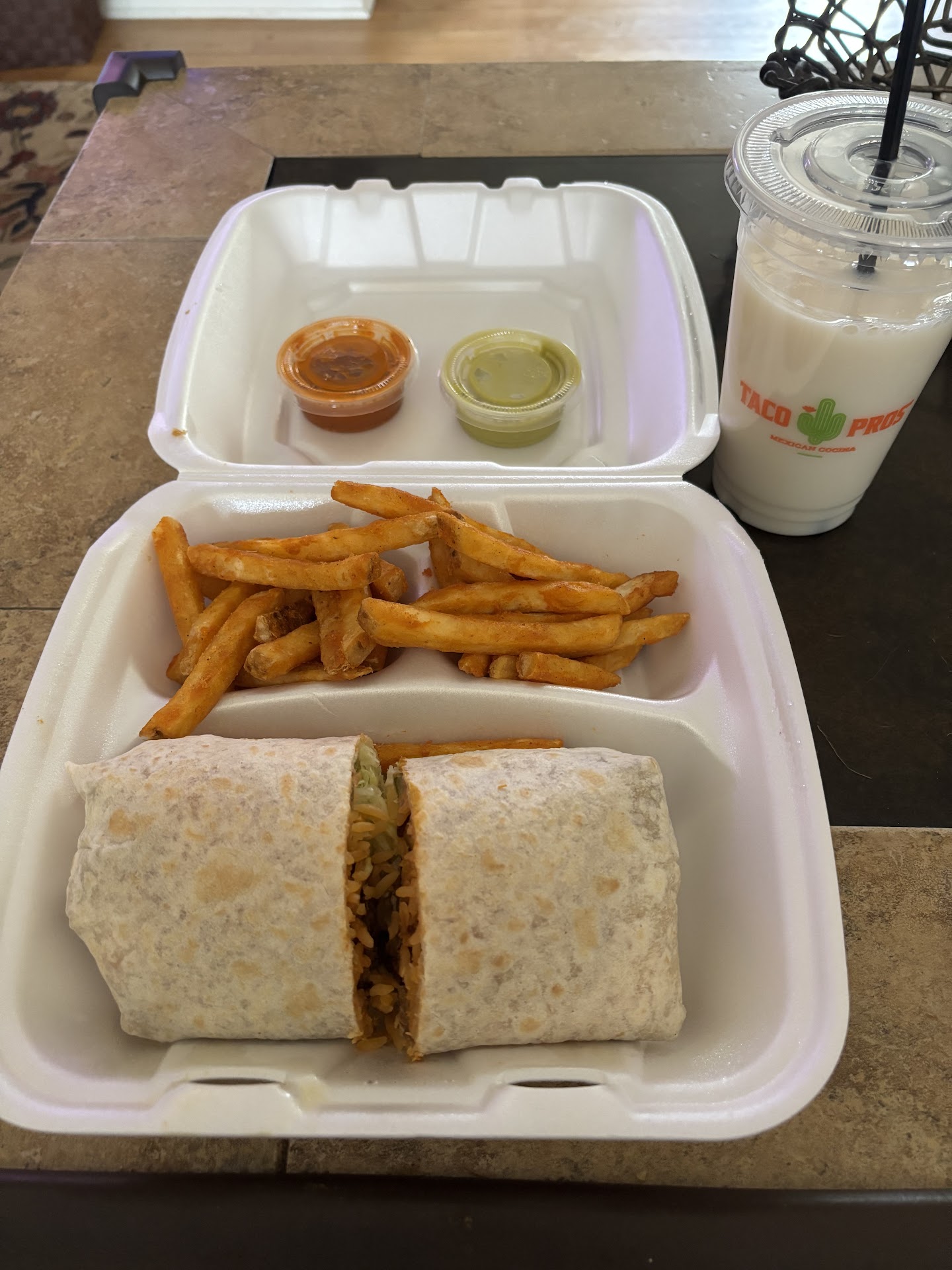 The food was lukewarm. The burrito appeared hefty, but it wasn't There was barely any meat in there. It was overpowered by tomatoes. It did not have rice in there as advertised on the website. It wasn't even on the side. I had my friend order 2 sides of salsa for me, because the menu didn't advertise it was included. The food was edible but it was lacking freshness and flavors.