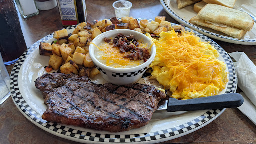 Read moreI've been here SEVERAL times, I once rated this place 1 star because of how horrible the service and food was. They have greatly improved in their customer service and staff has a way better attitude and are more attentive. However, the food still could use some work. I can say that they have a pretty good chicken fried steak and a chicken and waffle "dinner for breakfast". But they cheap out on their steak. I got the NY Steak and eggs "breakfast for dinner" with an extra order of toast. $4.00 for ultra dry toast, never again. And the NY Steak was ordered medium, and was super dry, it tasted like there was freezer burn and very bland. You'll notice in the photo just how THIN the steak was, and THAT is not your average NY steak size, so they must cut 1 steak in half to cut costs. Ordered eggs scrambled with cheese and the cheese wasn't even melted, overall temperature of the food wasn't hot. I enjoyed the fact that the staff has stepped up in making us feel welcomed, now the chefs and/or corporation has to step up and stop cheaping out on their food.