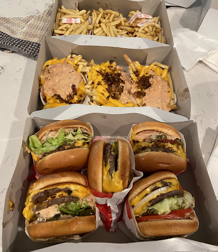 Read moreNot too sure what to say here. If you have been to an In-n-Out then you already know their limited menu, very affordable prices, and relatively quick service for the large number of customers they have at any one time. Burgers are fine, nothing really special, and the only option offered is with or without onions. Make sure you really want them if you say, "with," as mine usually come with copious onions. Fries are also quite generous, apparently measured with a shovel, and, for a fast food place, freshly cut, thin sliced, on site. There was one person who was just putting freshly peeled potatoes into the slicer, slicing, and dropping into the cookers. Well but not overly salted. I would think a great place for kids as the burgers are small enough for them to eat, and simple enough to not be "scary." I stop here regularly, even though the line of cars often goes through the lot, and still get served fairly quickly, fresh fries, and freshly...