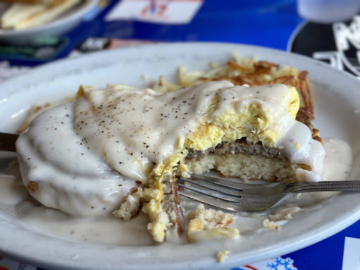 My husband got the chicken fried steak and hash browns- I tried a bite and it kind of just tasted like a giant chicken nugget covered in white gravy. But it wasnāt horrible