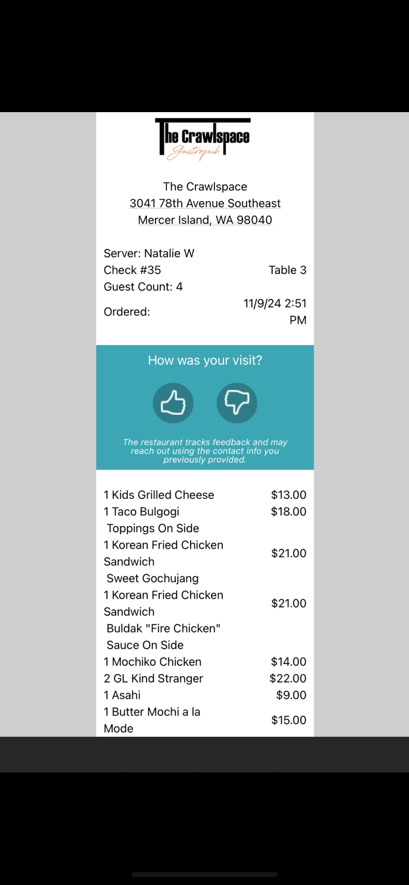When our meals finally arrived, they were not as hot as expected, although the taste was still good. Interestingly, the table two spots over from us appeared to be experiencing the same delay. We both ended up walking to the bar to get assistance since at this point, we were here for over 1.75 hours. To our surprise, new guests seated next to us ordered and received their food exactly what we had ordered in less than 10 minutes.