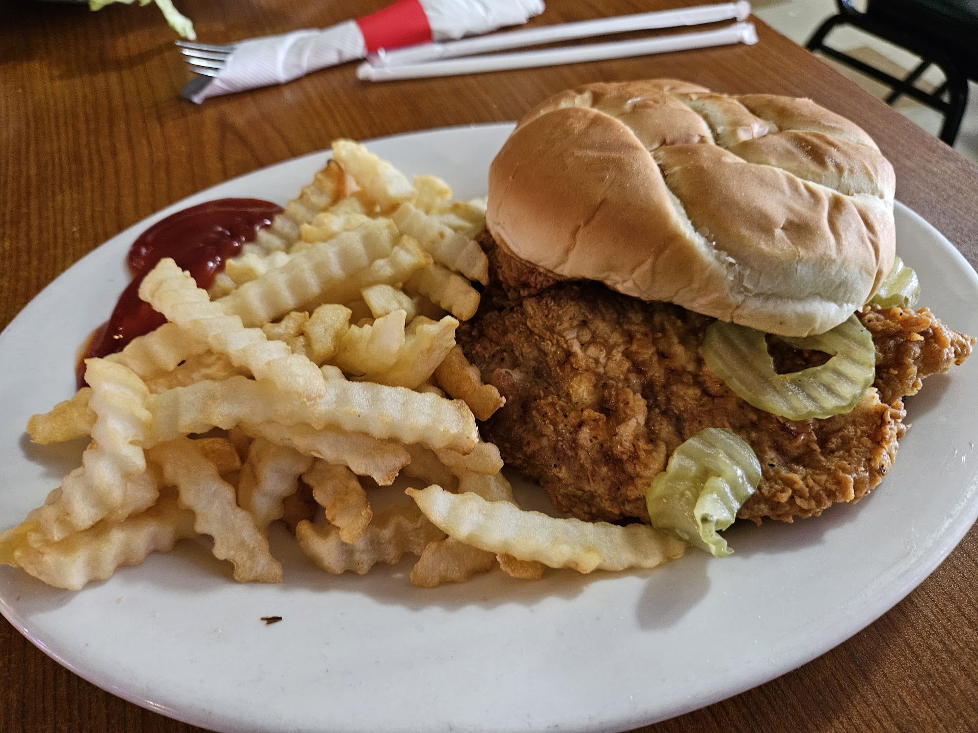 I don't frequent this establishment because of the many times I have eaten here and it was awful, however last time I brought my family down for dinner it was good. So today my husband and I stopped on our way home from shopping to get a quick sandwich. I guess I should have known better than to order something fried after they fried chicken all a.m. for their lunch special. The "hand breaded tenderloin" looked like nothing more than a fried butterfly pork chop and my breaded chicken was very tender on the inside, however you could taste the burnt flour from the fried chicken in the breading of the chicken sandwich and the fried pork chop. Was not impressed, will probably not go back again for sometime as this was the reason I quit going there in the first place. Nothing has changed apparently and I guess if people don't complain it will...