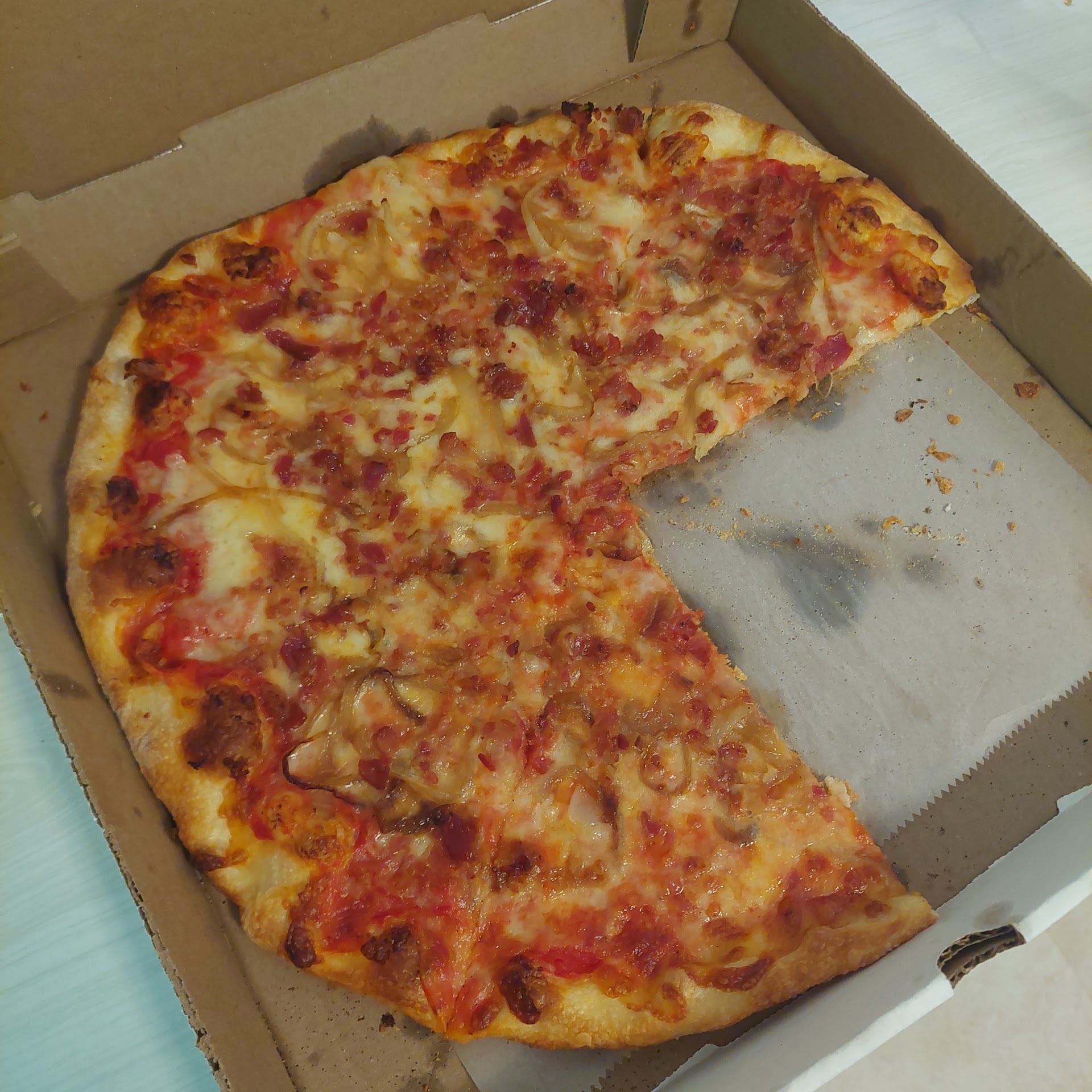 Tonight we got the pepperoni stuffed bread, and it was awesome. Crispy on the outside, loaded inside, and the side of sauce it came with was surprisingly flavorful, not just an afterthought like at some places. We also got a bacon and onion pizza which was fantastic, perfectly cooked, great balance of flavors, and honestly just a great pizza.